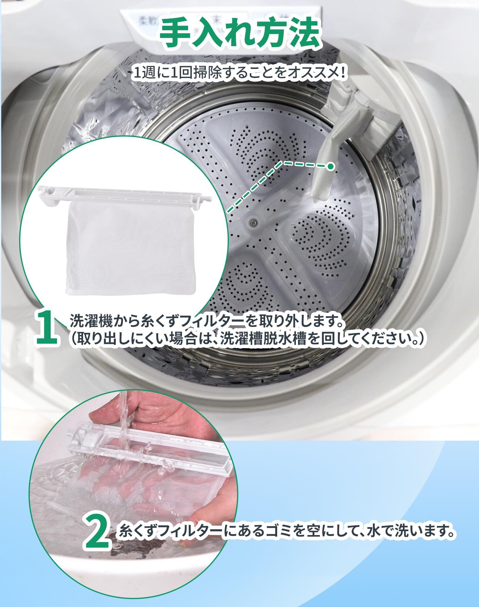 【洗濯機寿命延長】洗濯物をきれいに保つために、洗濯機の使用頻度によって、洗濯機の糸くずフィルターは、少なくとも1週間を目安に定期的に洗濯してください。定期的にフィルターの掃除を行い、効果的なフィルタリングを維持してください。【取り替え方法】①糸くずフィルターの先端部を押して、洗濯機より外します。(取り出しにくい場合は、洗濯槽脱水槽を回して下さい)。②糸くずフィルターを綺麗に洗います。③綺麗になった糸くずフィルター或は新品を洗濯機に嵌める位置に合わせて差し込みます。