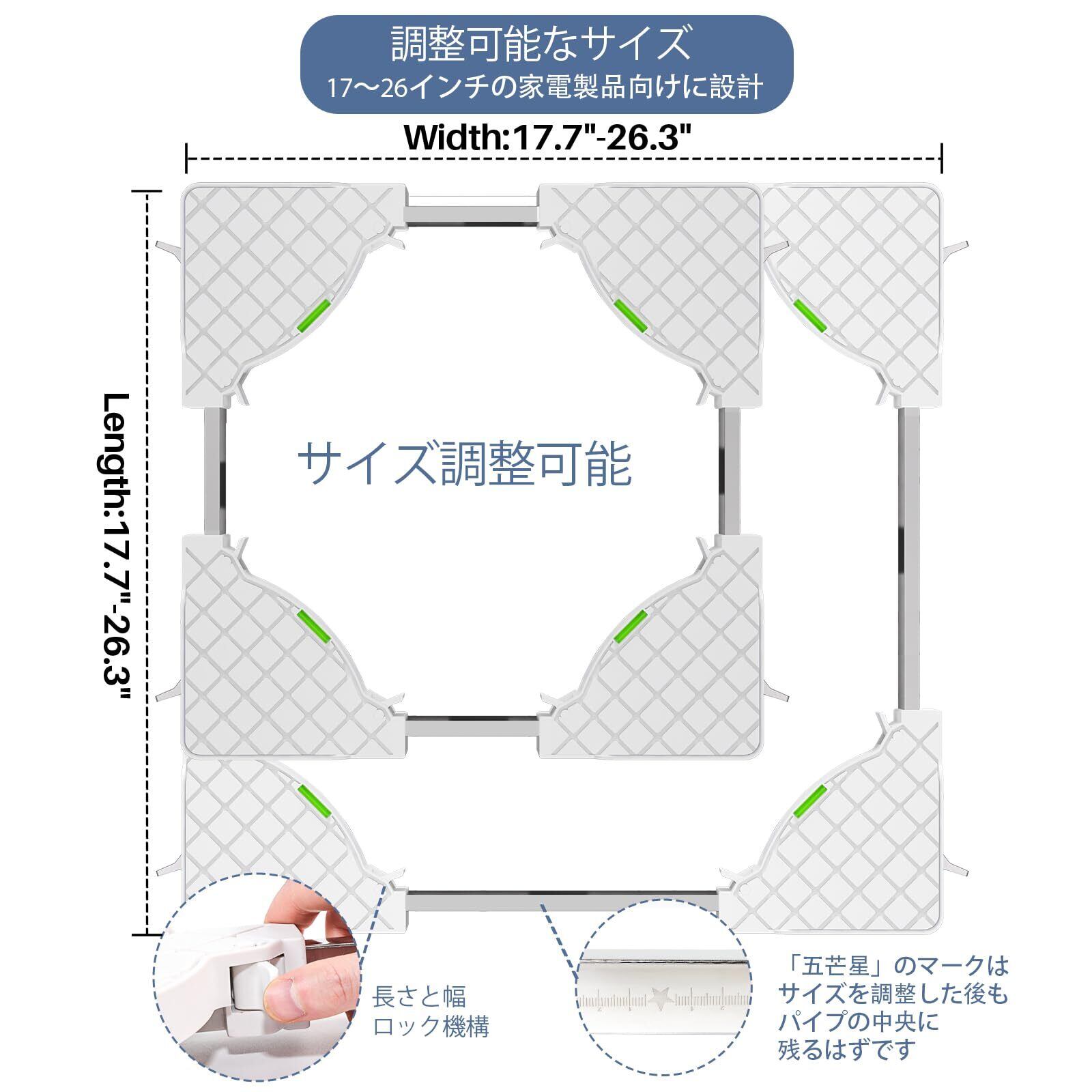 【伸縮調整可能】洗濯機や冷蔵庫など大型家具のサイズに合わせて、置き台の幅や奥行きを自由に調整できます。幅調整範囲:45.5cm-70cm、高さ:4cm