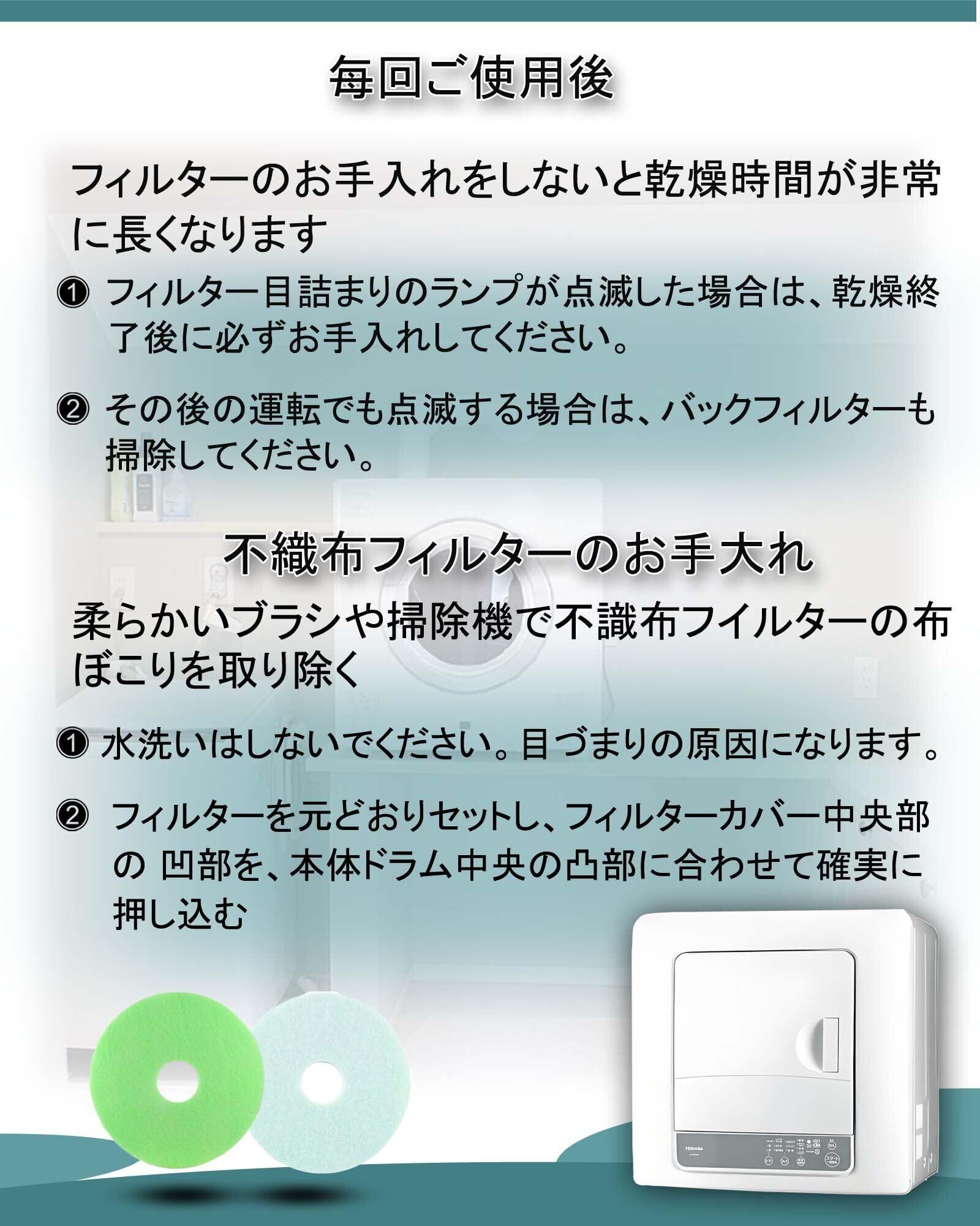 【交換目安】約1年。フィルターが薄くなった時や、フィルターを掃除しても「フィルターお手入れ」ランプがつき、ブザーが鳴る場合(間にあるフィルターが目詰まりしている時)はフィルター交換が必要です。(水洗いはしないで下さい。)【注意】購入前に、乾燥機の型番がフィルターと互換性があるかどうかをご確認ください。