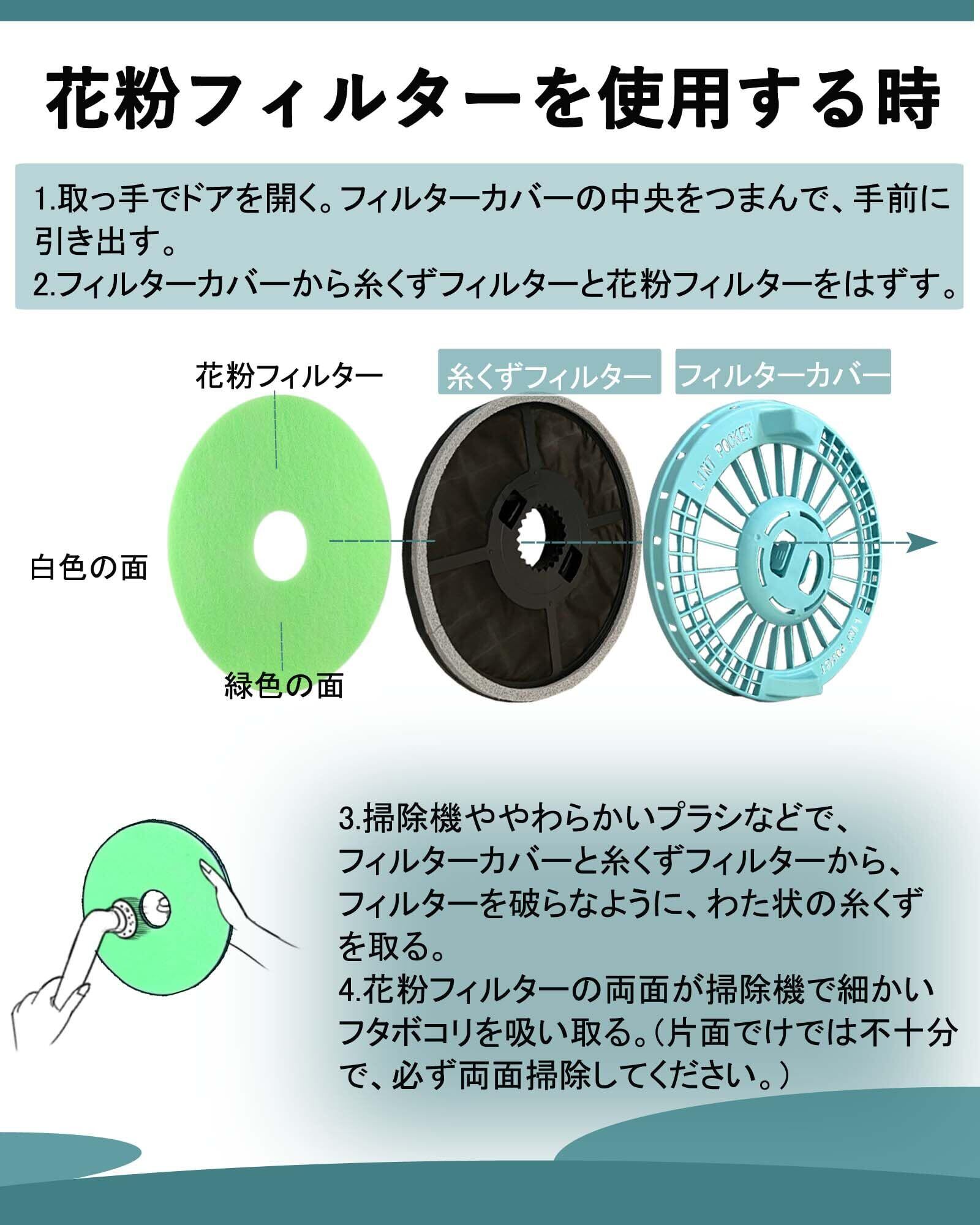 【使用簡単】東芝 乾燥機 フィルター を使う時、フィルターカバーに糸くずフィルターと、花粉フィルターを押してセットします。花粉フィルターは、緑色の面を糸くずフィルター側に向けて取り付けてください。誰でも簡単に交換でき、乾燥機内をいつも清潔に保てます。