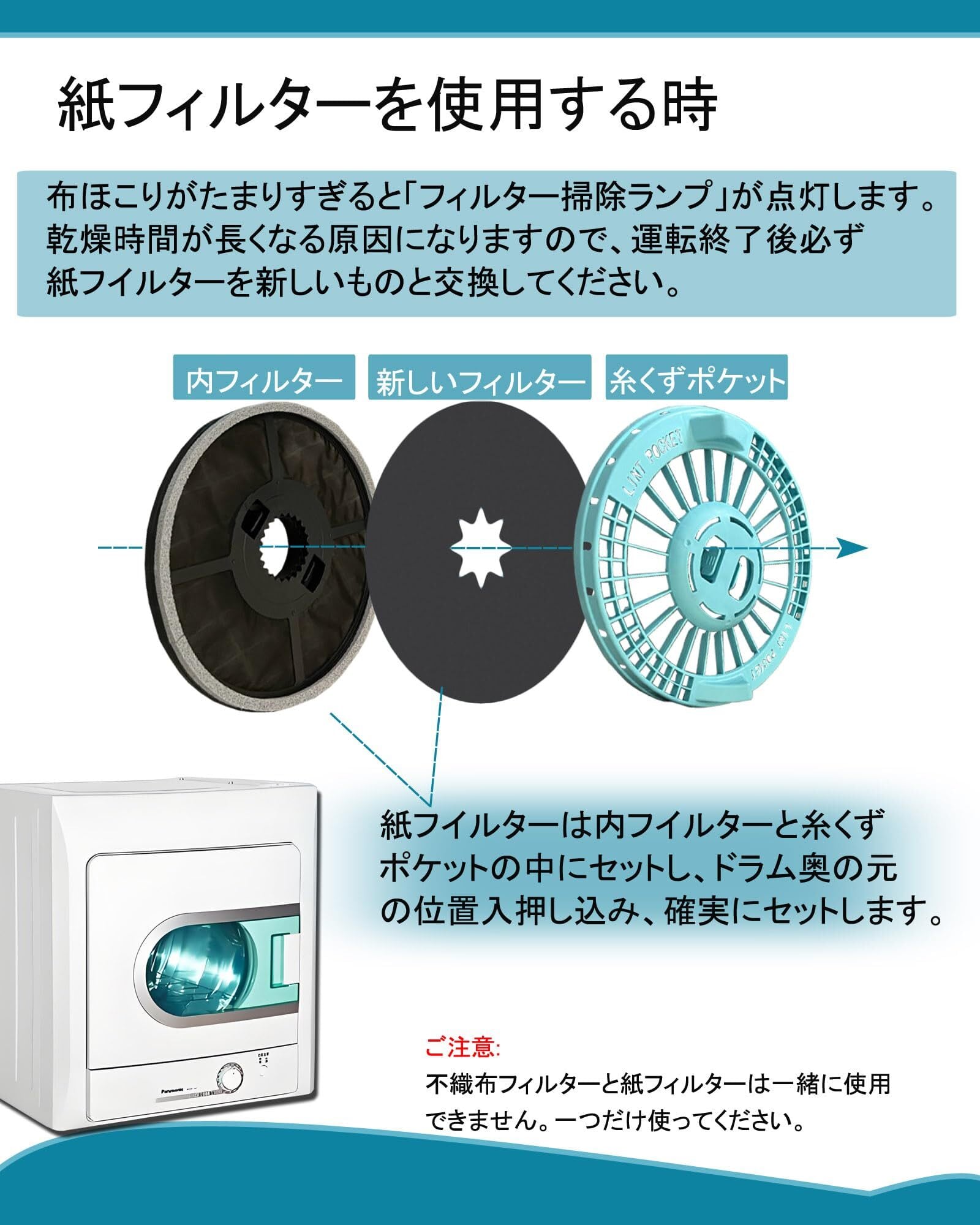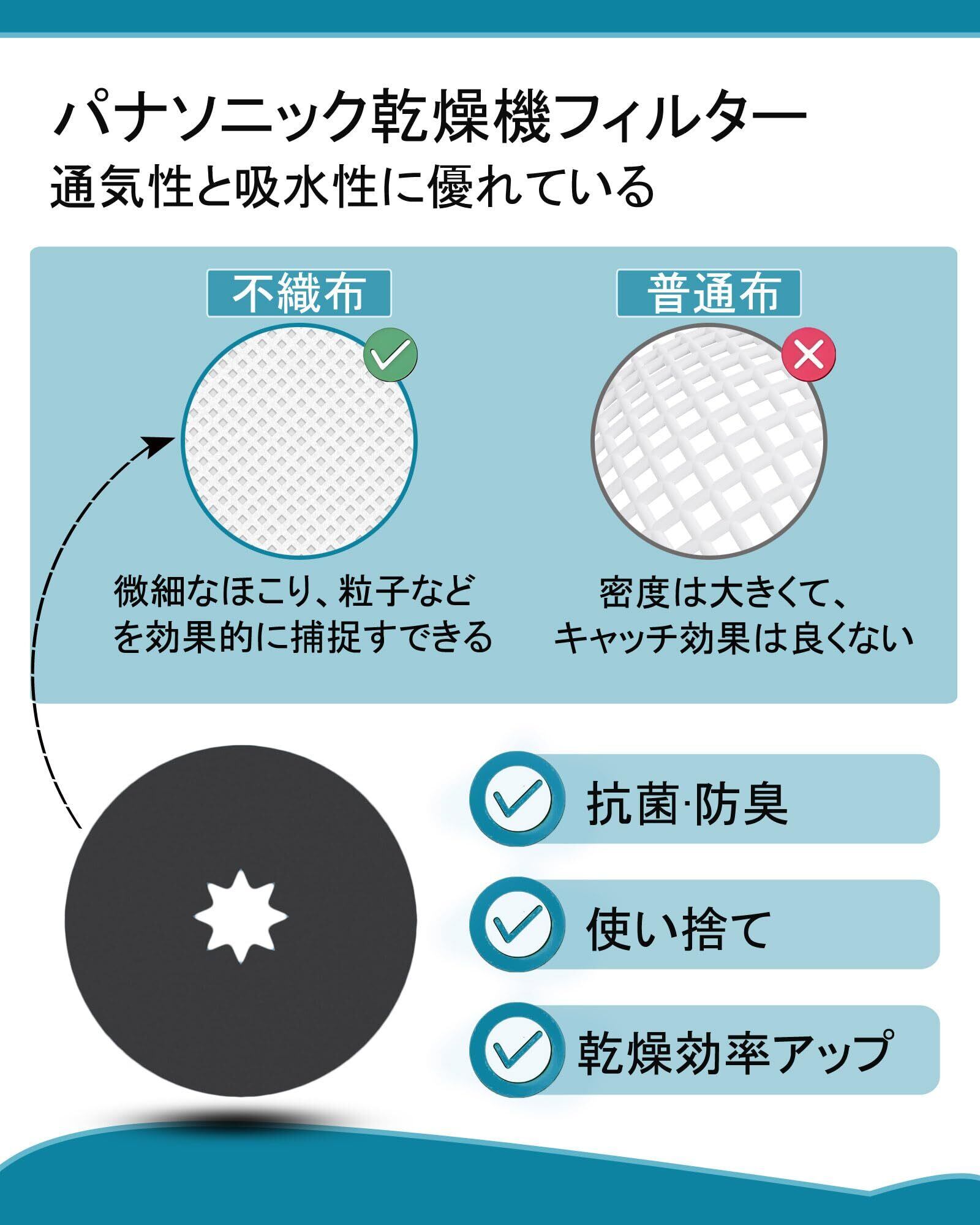 【高性能フィルター】このパナソニック専用の紙フィルターはは高密度のペーパー製で、濾過能力抜群、衣類から落ちる繊維やホコリを確実に捕集します。乾燥機のフィルターの掃除によるストレスを解消し、快適な生活環境を維持することができます。