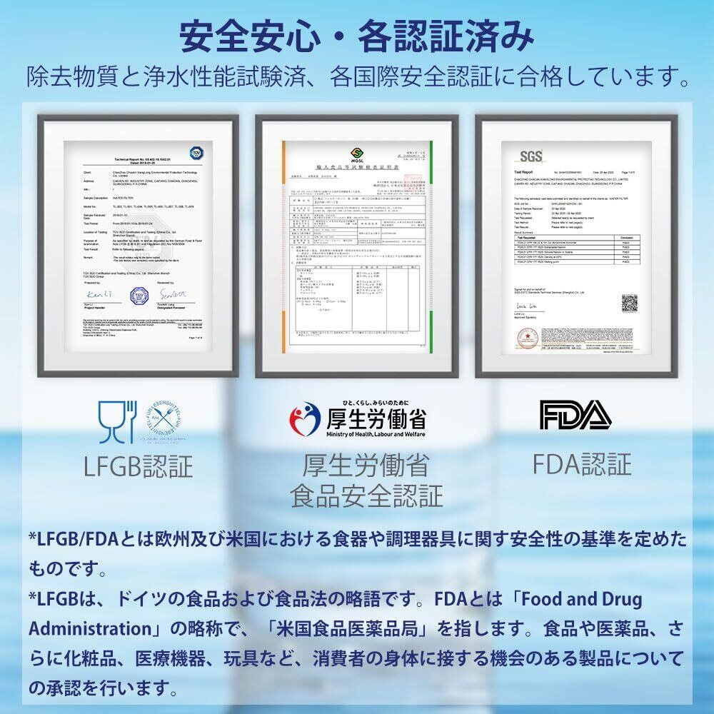 【除去物質・浄水性能試験済】砂など細かな粒子、水アカ、銅や鉛などの重金属、味や臭いを損なう塩素やクロラミンなどの物質を除去、水道水を綺麗で美味しい水に変えます。本製品はFDA認証、LFGB認証、食品安全認証などの国際安全認証に合格しています。どうぞ、安心してお使いください。