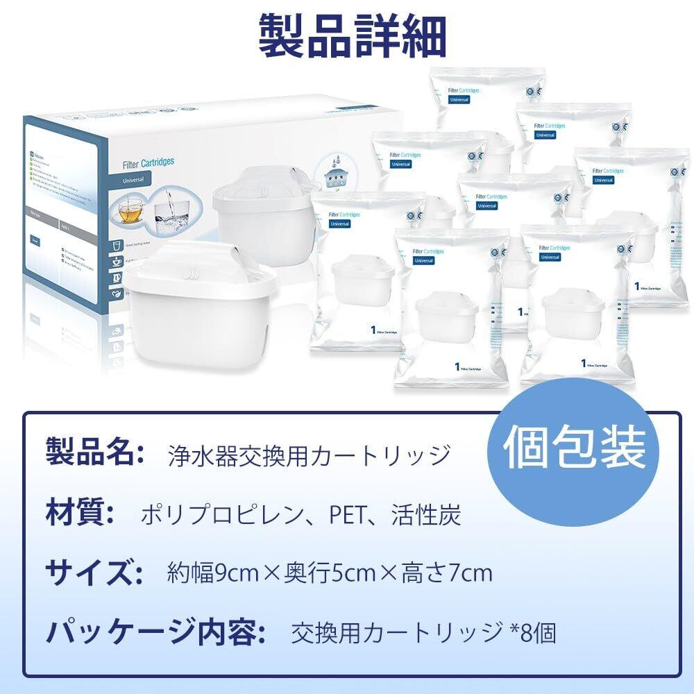 【商品仕樣・8個セット入】浄水器交換用カートリッジの互換品です。サイズは約幅9cm×奥行5cm×高さ7cmです。材質:ポリプロピレン、PET、活性炭。ブリタのポット型・タンク型浄水器の全モデルにご使用いただけます。(クラシックタイプを除く)