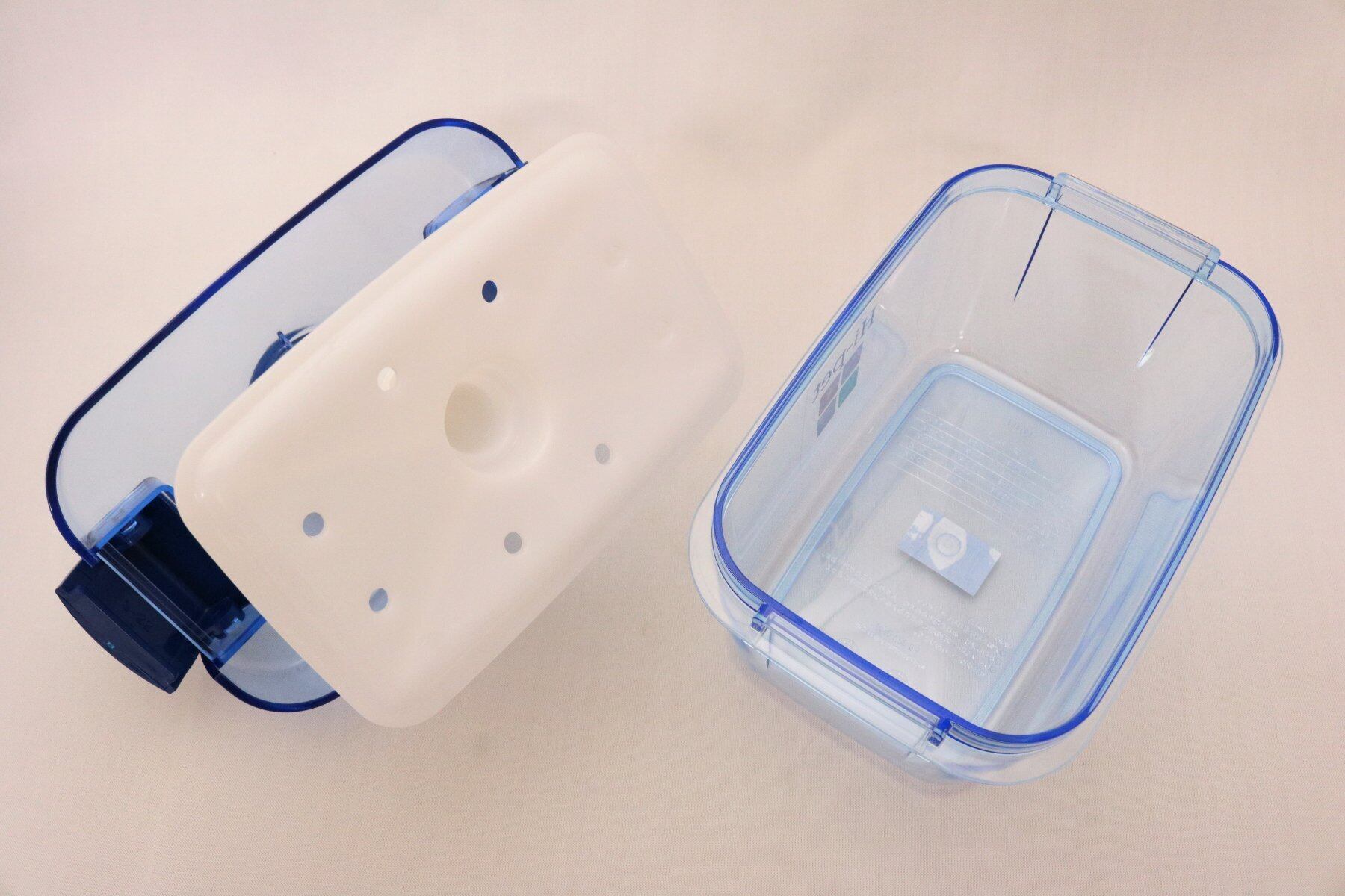「リス 即席漬物容器」は、スタイリッシュな角型デザインが特徴で、キッチンに置いてもスペースを取らず無駄がありません。透明なクリアブルーのボディは中身が見やすく、残量をすぐに確認できるのも嬉しいポイントです。レシピ付きなので、簡単に美味しい漬物作りが楽しめます。