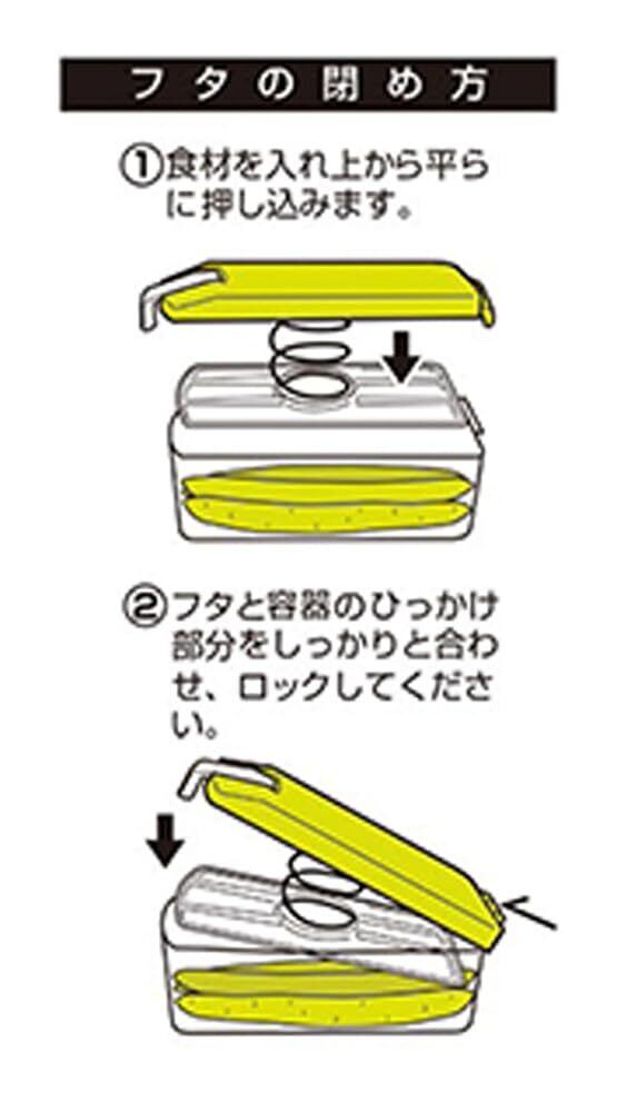 蓋と押板が一体型になった漬け物器。食材を入れて蓋を閉めるだけで簡単浅漬けを作ることができます。