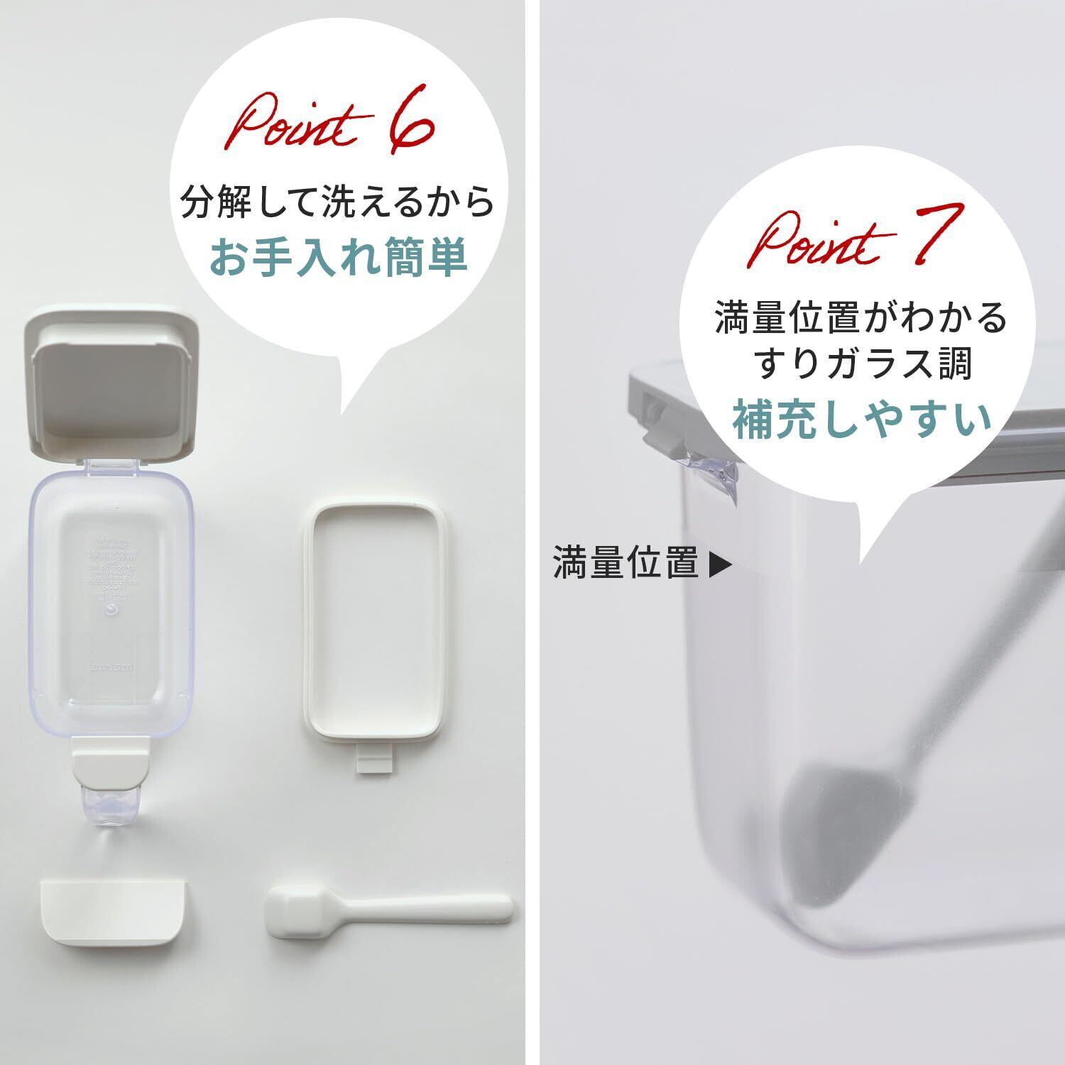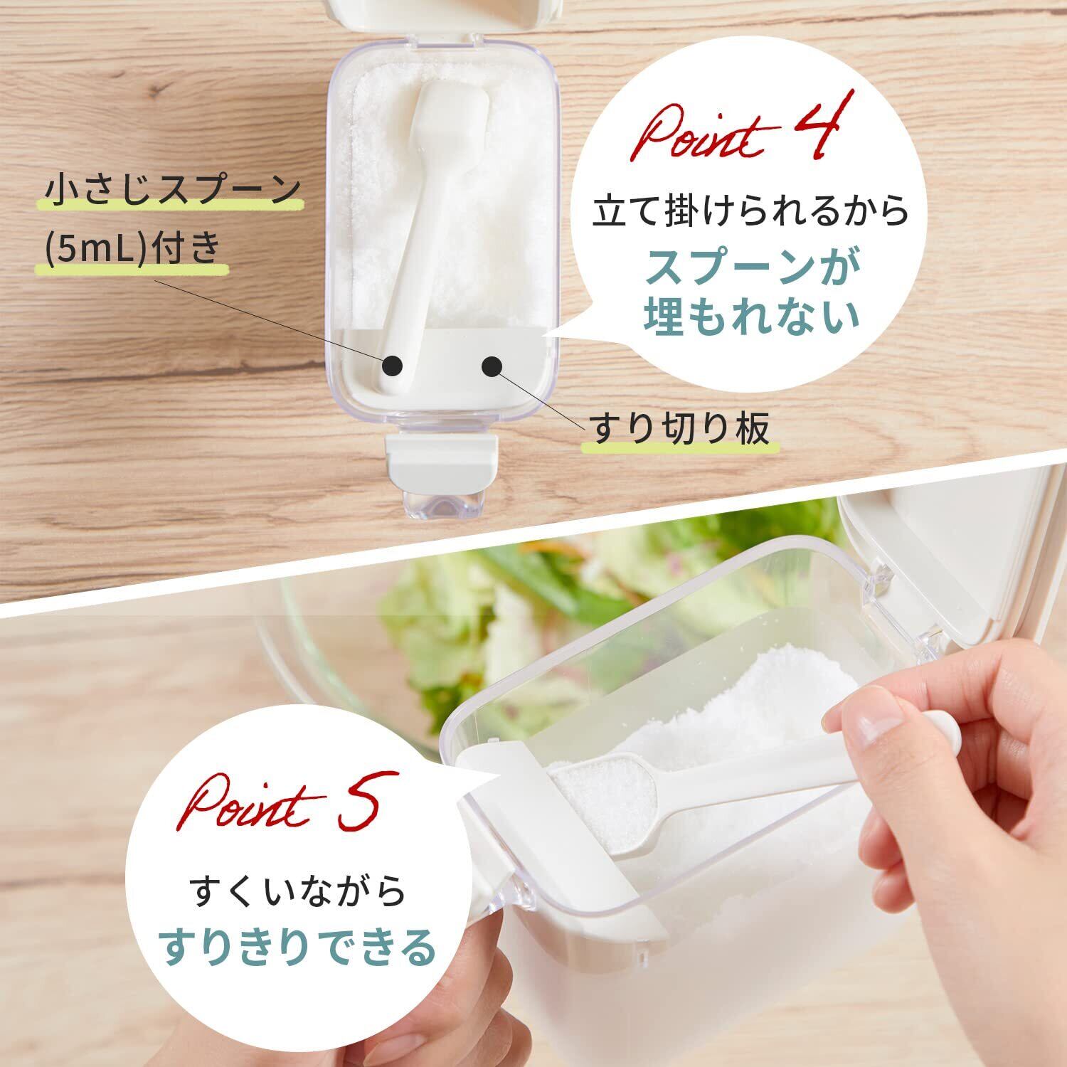 【便利な小さじスプーン付き】小さじ1(5ml)スプーンと、すり切り板付きで簡単に計量ができます。すり切り板にスプーンを立て掛けられるので、スプーンが調味料に埋もれず衛生的。パッキンとすり切り板は分解して洗えます。※蓋は取り外し不可となっております。