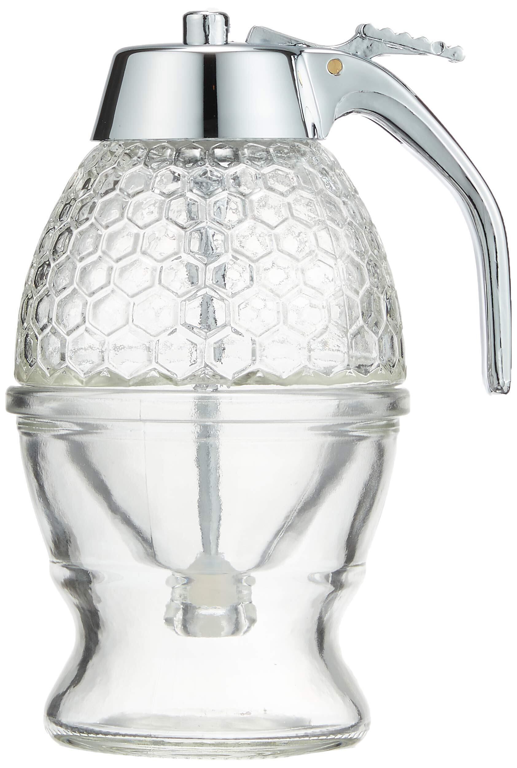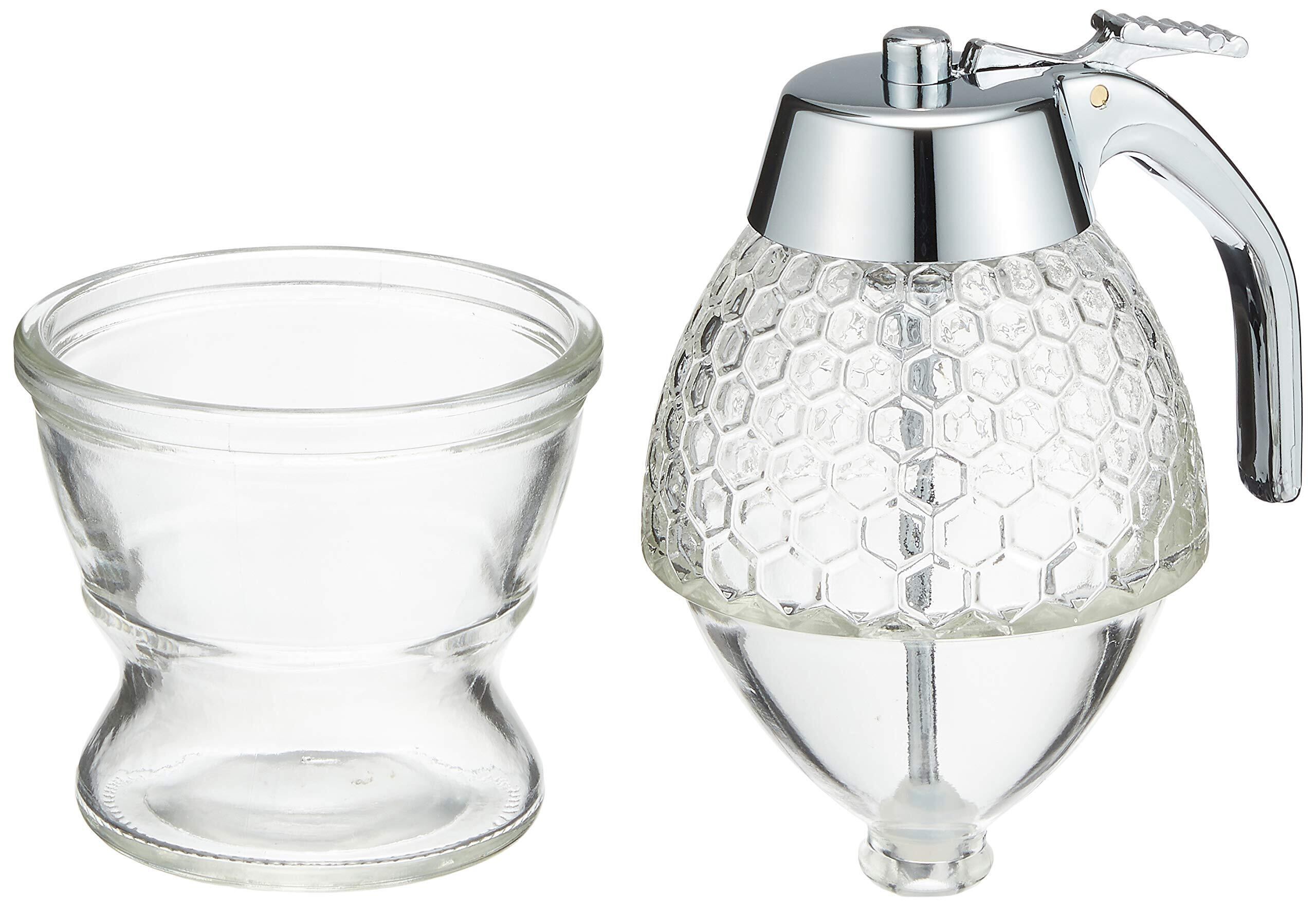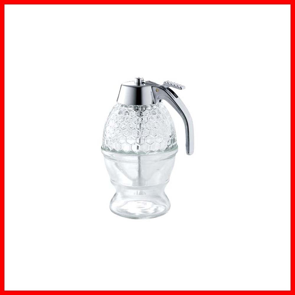 毎日の食卓を美しく彩る、佐藤金属興業のハニーディスペンサーです! / 特徴:受皿式で、収納も簡単。透明なガラス製で、中のハチミツが一目で見えるデザインが魅力です。大切なハチミツを美しく保管し、使いやすく、華やかな演出をしてくれます。
