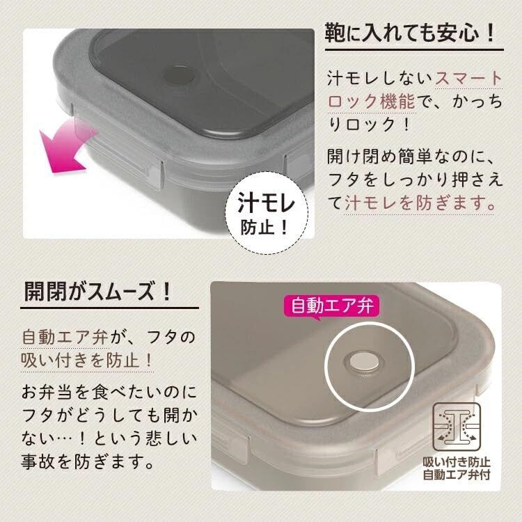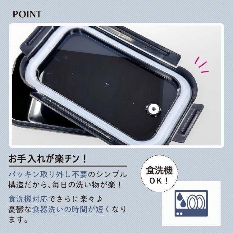 4点ロックで汁漏れを防ぐ。パッキン取り外し不要でお手入れ簡単。抗菌加工、電子レンジ対応、冷凍保存可、食洗器OK