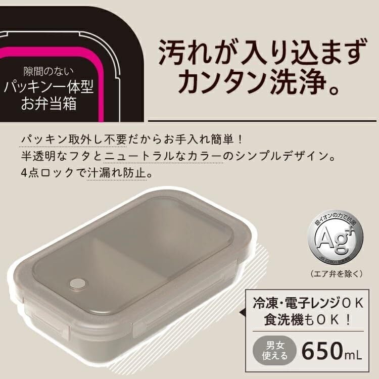 毎日のランチタイムを彩る「アスベル 弁当箱」が新登場です! / 特徴:この弁当箱は650mlの容量で、パッキン一体型のデザインが特徴。グレーのスタイリッシュな色合いが、ビジネスシーンや学校にぴったりです。