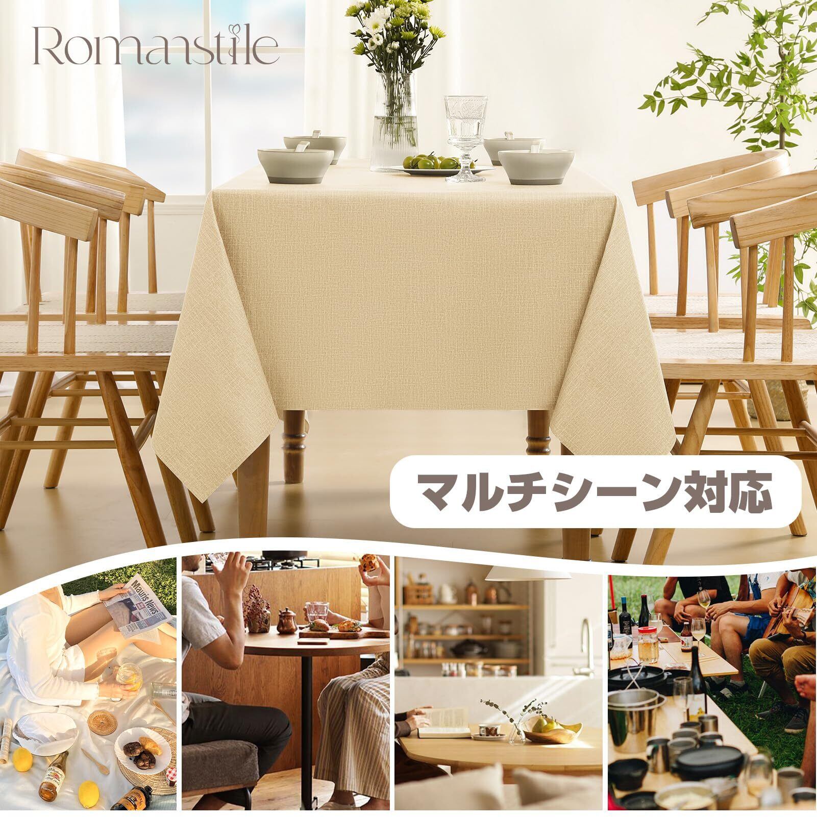 Romanstile テーブルクロス ビニール おしゃれ 撥水 大判 長方形 140×220cm 麻布風 厚手 table cloth 桌布 テーブルカバー PVC 防水 防油 防汚 防カビ 耐熱 カット可能 汚れ防止 お手入れ簡単 無地 シンプル 北欧 秋 クリスマス お正月 ダイニング カフェ レストラン ピクニック アウトドア ベージュ