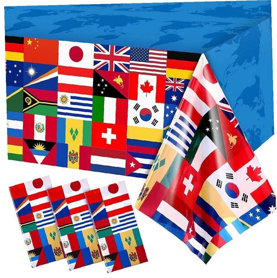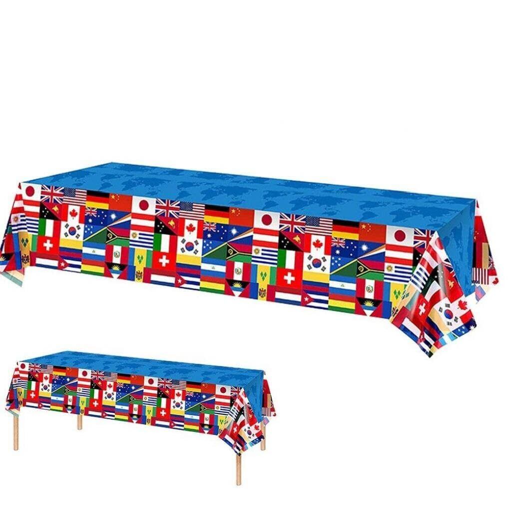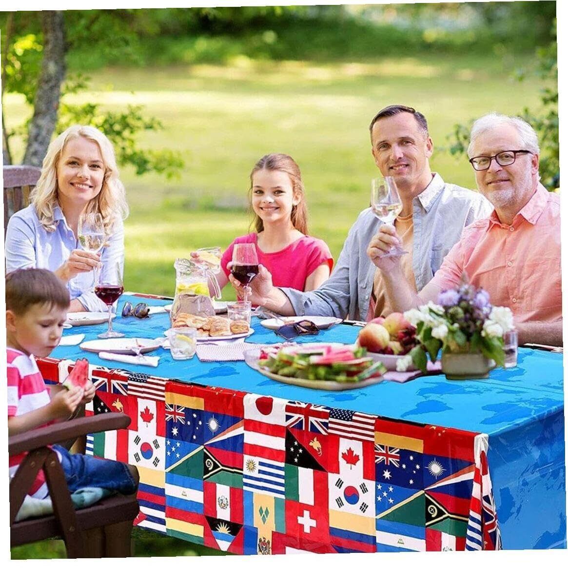 カラフルで多様な国旗デザイン:テーブルクロスにはさまざまな国際旗が描かれており、さまざまな国の多様性と団結を示しています。これにより、パーティーに活気のあるお祝いの雰囲気が加わり、全体の装飾が向上します。