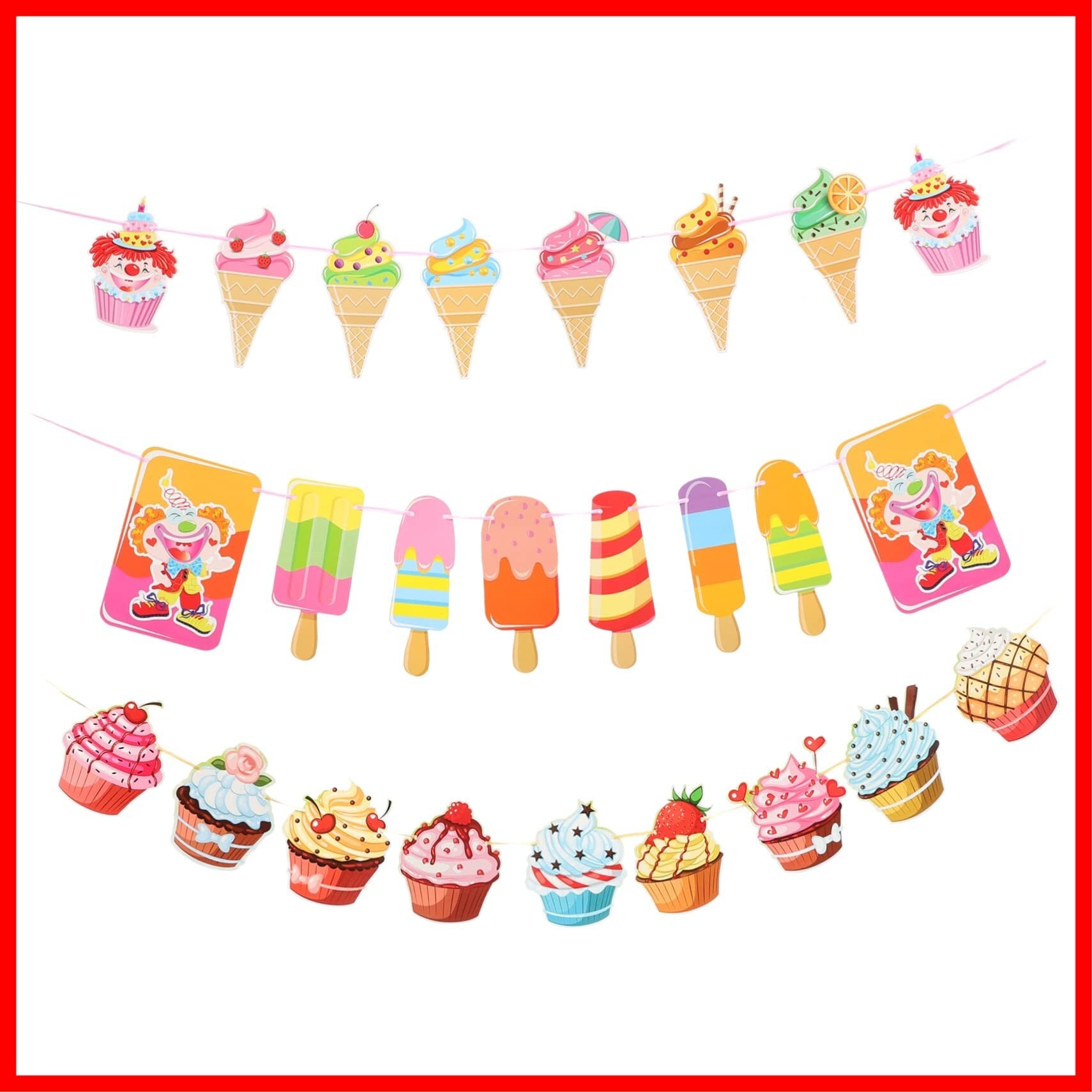 Lurrose アイスクリームバナー 3セット アイスクリームカップケーキデコレーション 誕生日パーティー パーティーバナー 軽量 耐久性 使用可能