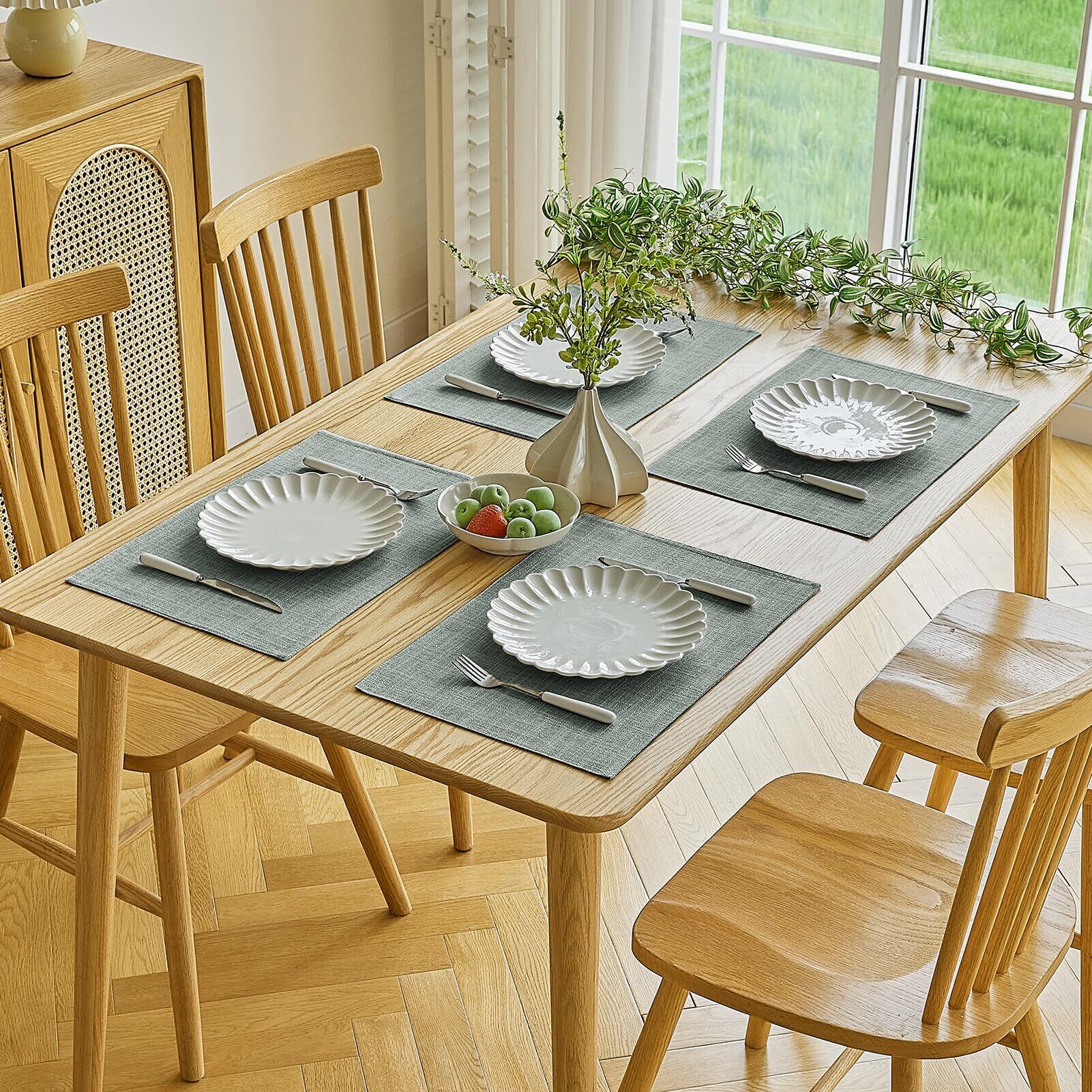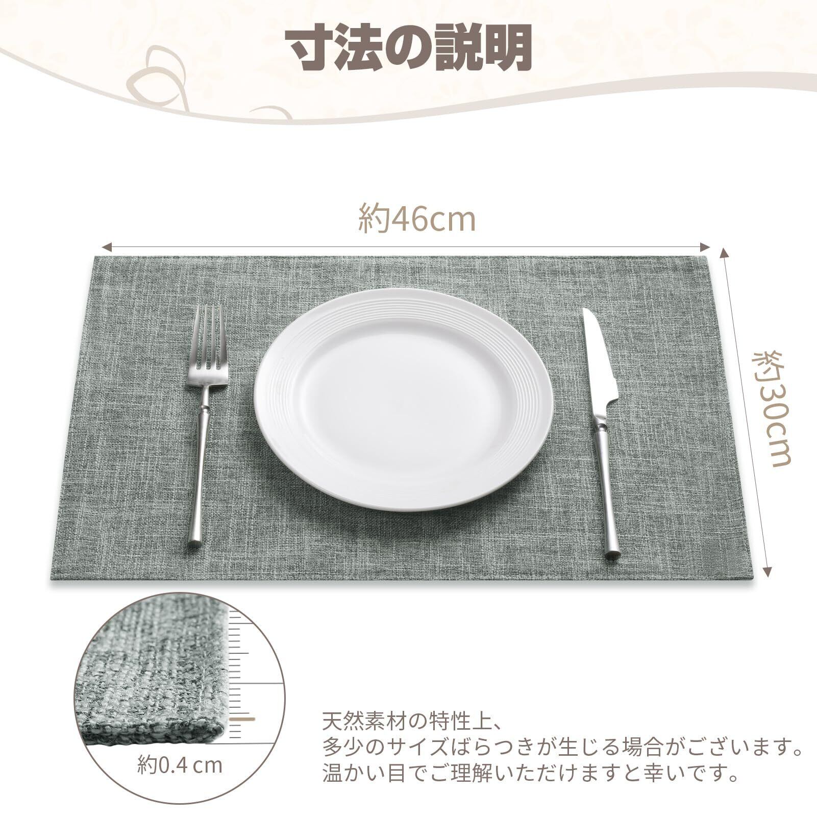 【おしゃれなデサイン】麻風なテクスチャーだけでなく、本店厳選のグレー、ダークグレー、ブラウン、ベージュ、イエロー、グリーン6色展開で、お好みのカラーをお選びいただけます。お客様はさまざまな色のマットを使って食卓の雰囲気を変えることができます。それ以外、お客様は他に好きな色があれば、メールで貴重なアドバイスをしてくれることを歓迎します。私たちはすべてのお客様からのアドバイスに真剣に対応し、できるだけお客様のニーズに対応します.