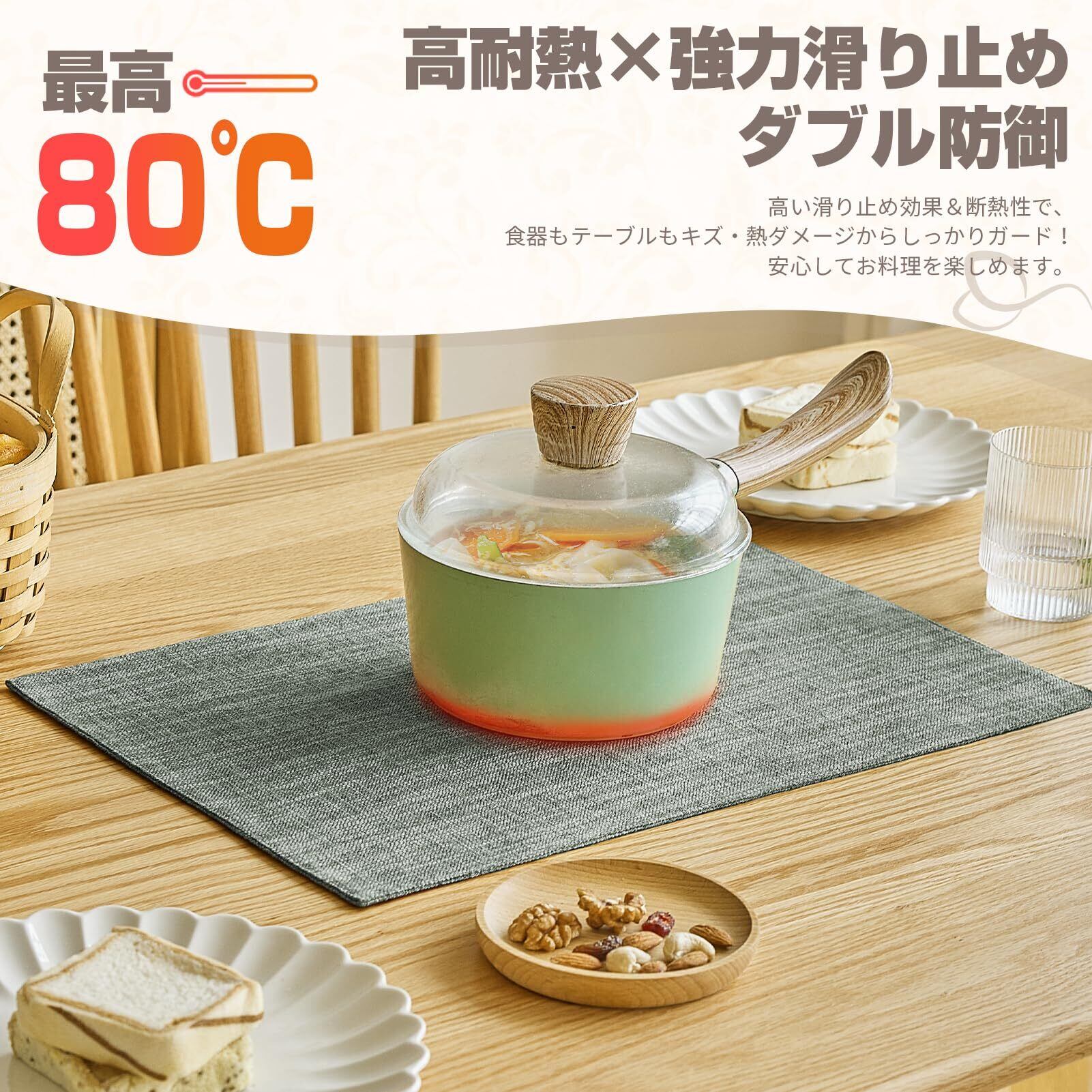 裏面には滑り止め加工が施されているため、使用中にずれる心配がありません。また、断熱効果が高く、熱い食器を直接置いてもテーブルを傷めることがありません。