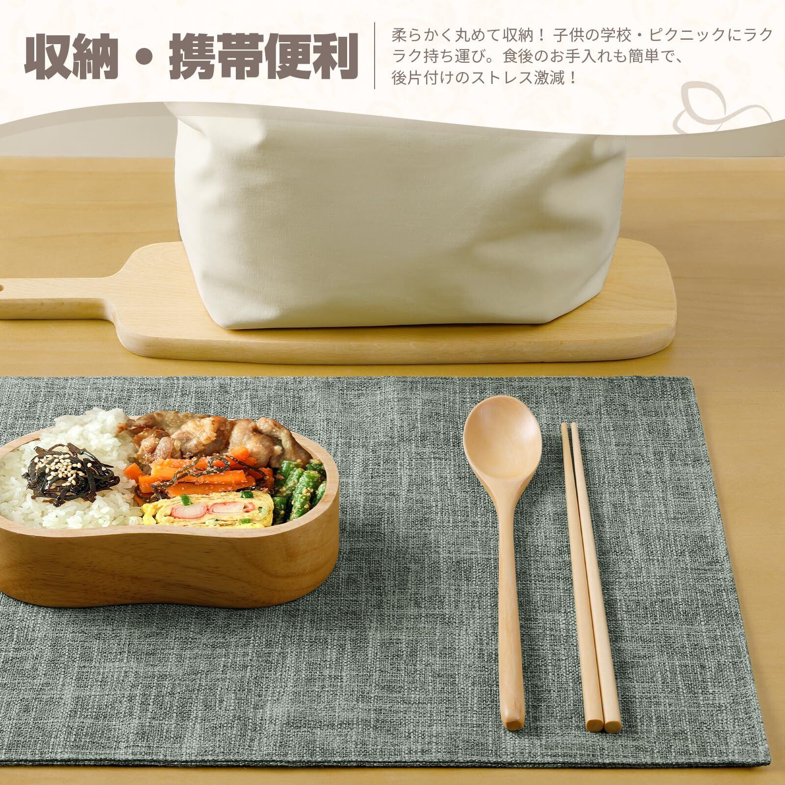 【様々な場合】本品は丈夫で耐久性に優れたポリエステル素材で作で、シンプルな色合いとおしゃれなデザインで、様々なシーンで活躍します。日常の食事で食卓の雰囲気を改善し、お食事の時間をより快適にお過ごしいただけます。その優秀な防滑性と断熱性はお客様の食卓と食器をちゃんと保護します。柔らかく折り畳める特性で、お子様が学校やピクニックに持ち運びやすく、食後のテーブルお手入れが簡単にできるので、後片付けの手間を大幅に軽減!それだけでなく、レストラン、食堂、ホテル、幼稚園、パーティーなどの場所も使うことができます。