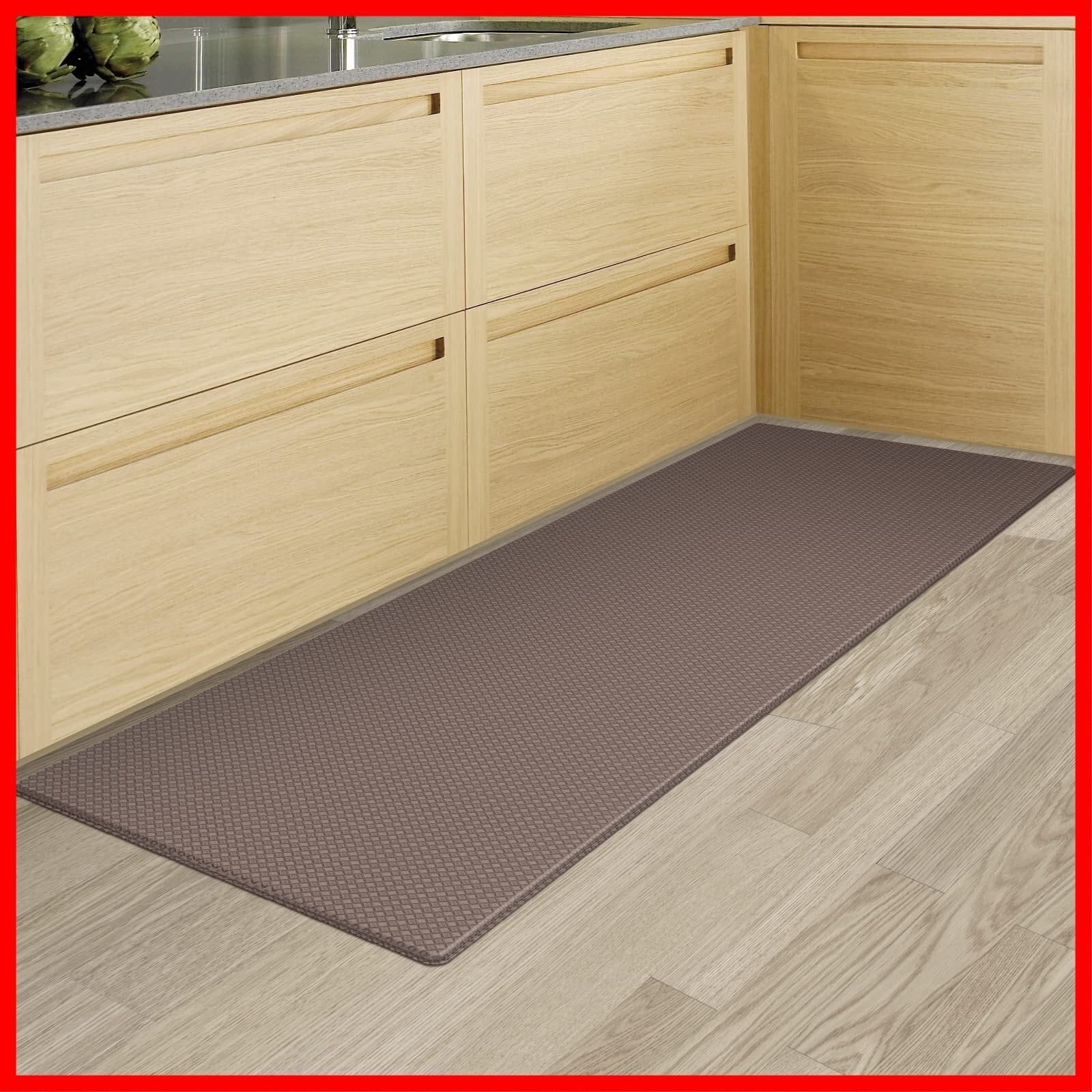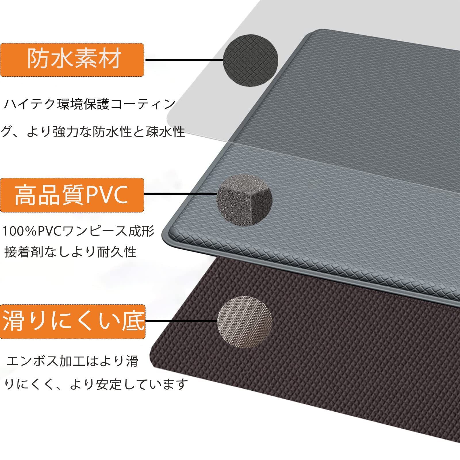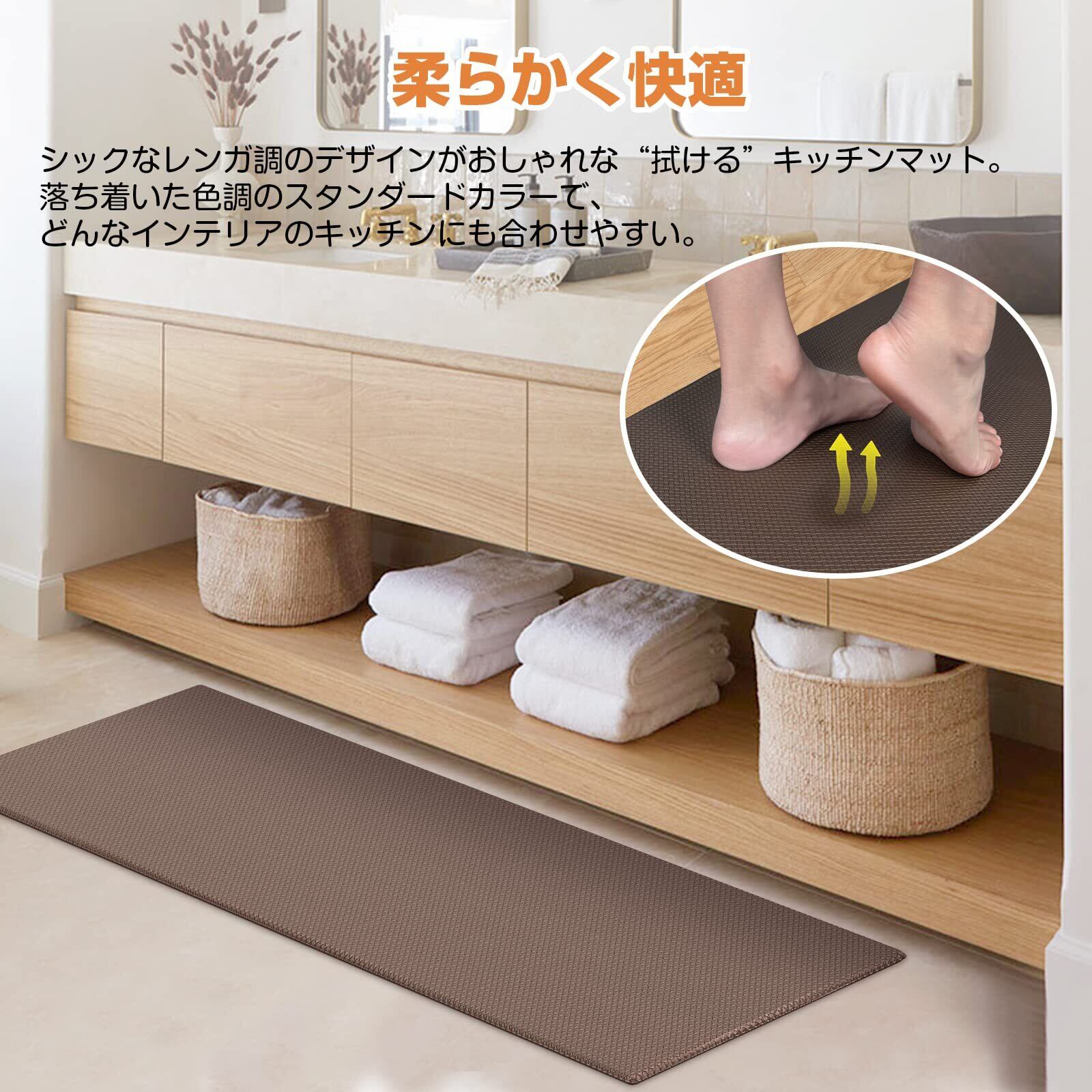 快適で便利な「キッチンマット 拭ける」で、あなたの台所をさらに居心地の良い空間にしてみませんか!/特徴:こちらのキッチンマットは、厚さ10mmのフカフカなクッション性を提供し、足元に優しい踏み心地を実現しています。ブラウンの落ち着いた色合いが、どんなキッチンインテリアにもぴったりです。