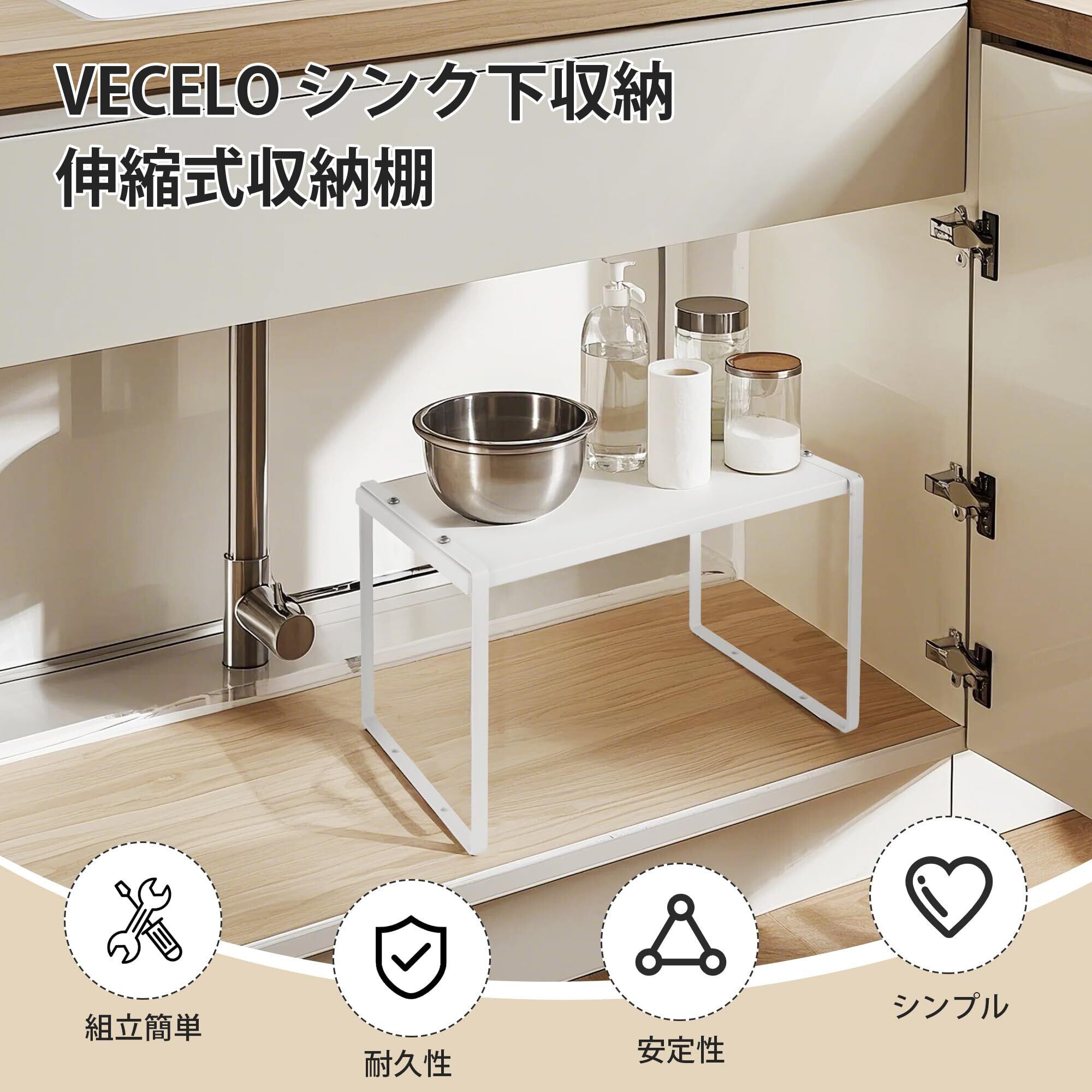 キッチンの収納力をアップさせる「VECELO 収納棚」で、整理整頓された快適な空間を手に入れませんか!/特徴:この収納棚はシンプルで洗練されたホワイトデザインが魅力。幅は33.8~59cmまで伸縮可能で、奥行20.8cm、高さ22cmと、さまざまなシンク下に適応し、スペースを無駄なく活用できます。