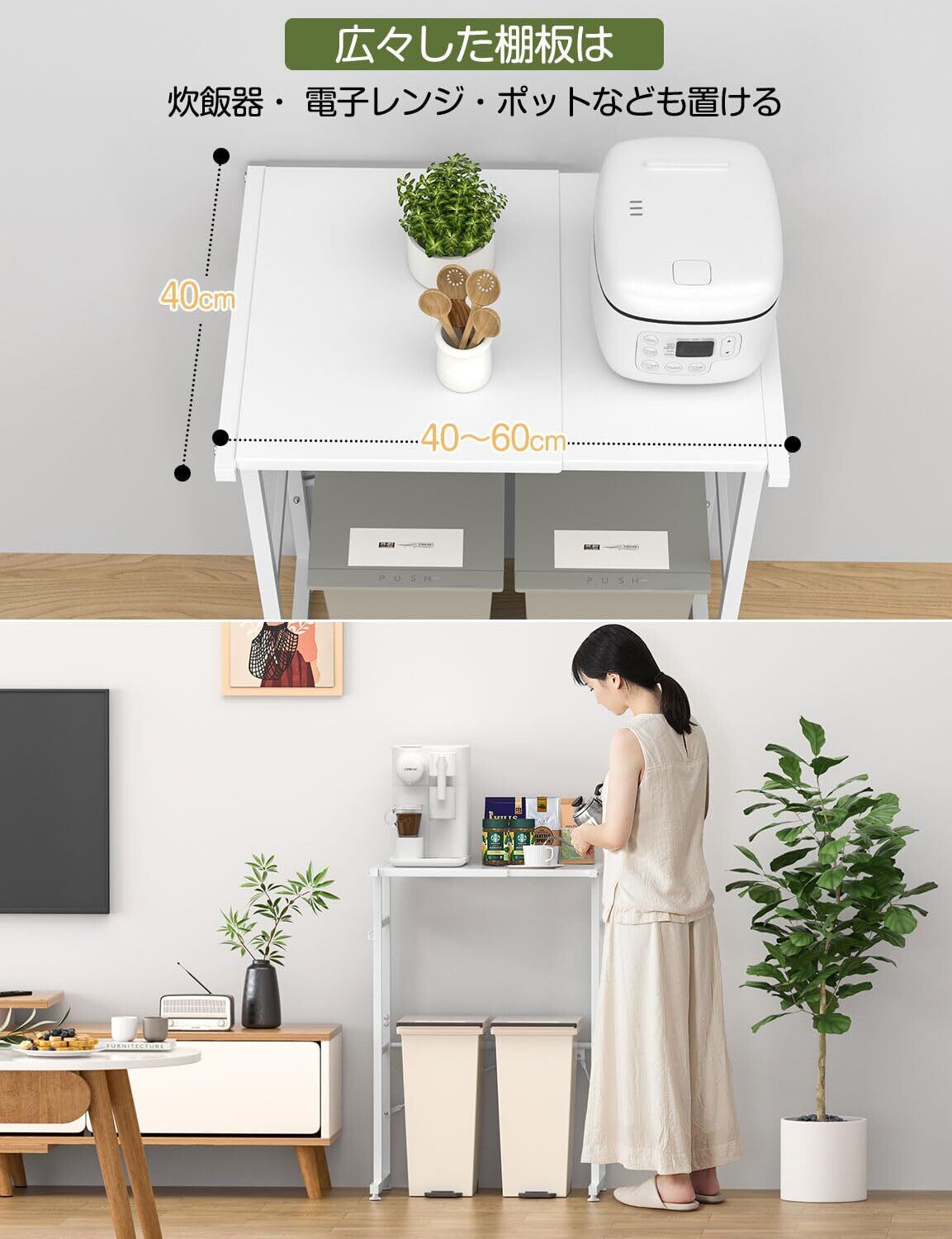 【高さ84.5cm以下のフタ付き・ペタル式・分別ごみ箱2個に適用】ペタル式や蓋つきのゴミ箱も開けた高さは84.5cm以下であれば、ゴミ箱の蓋がラックの天板に当たることなく快適にご使用いただけます。(※ご使用予定のゴミ箱のサイズをあらかじめご確認ください。)伸縮式で横幅が40~60cmの間にねじを回しだけ調整することで、分別用ゴミ箱2個が並べても置けます。ゴミ箱やワゴンを置ける棚下スペース、デットスペースの有効利用、無駄のない空間活用で充実のキッチンライフへ。