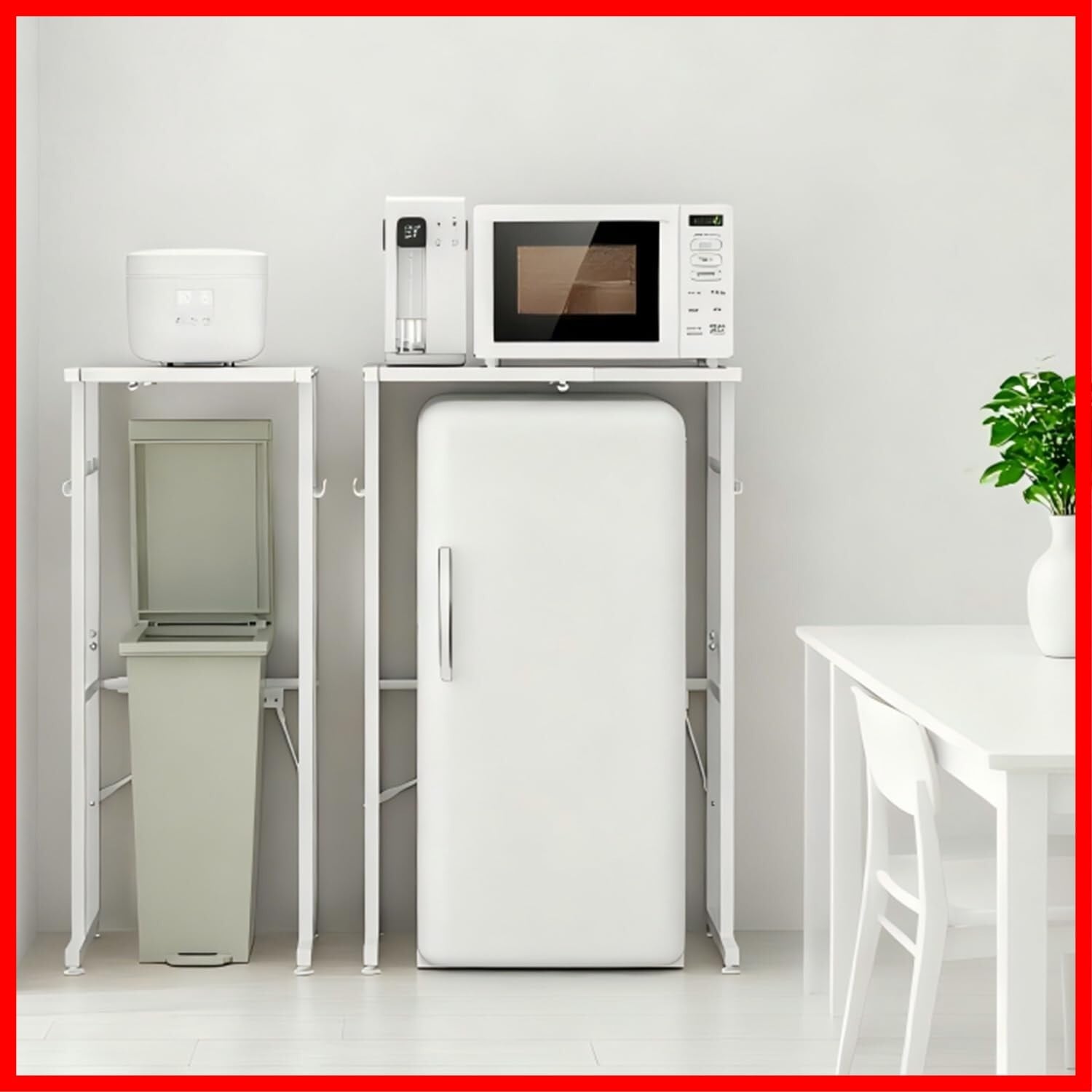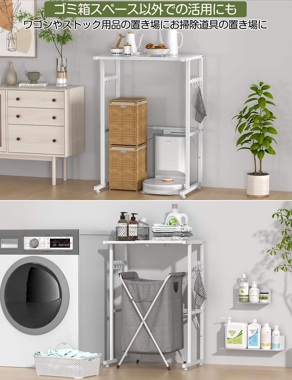 Holdm ゴミ箱上ラック幅伸縮 40~60×奥行40×高さ86.5cm レンジラック スチール 耐荷重50kg フック8個付 アジャスター付き ゴミ箱上収納 きっちんらっく収納 (ホワイト)