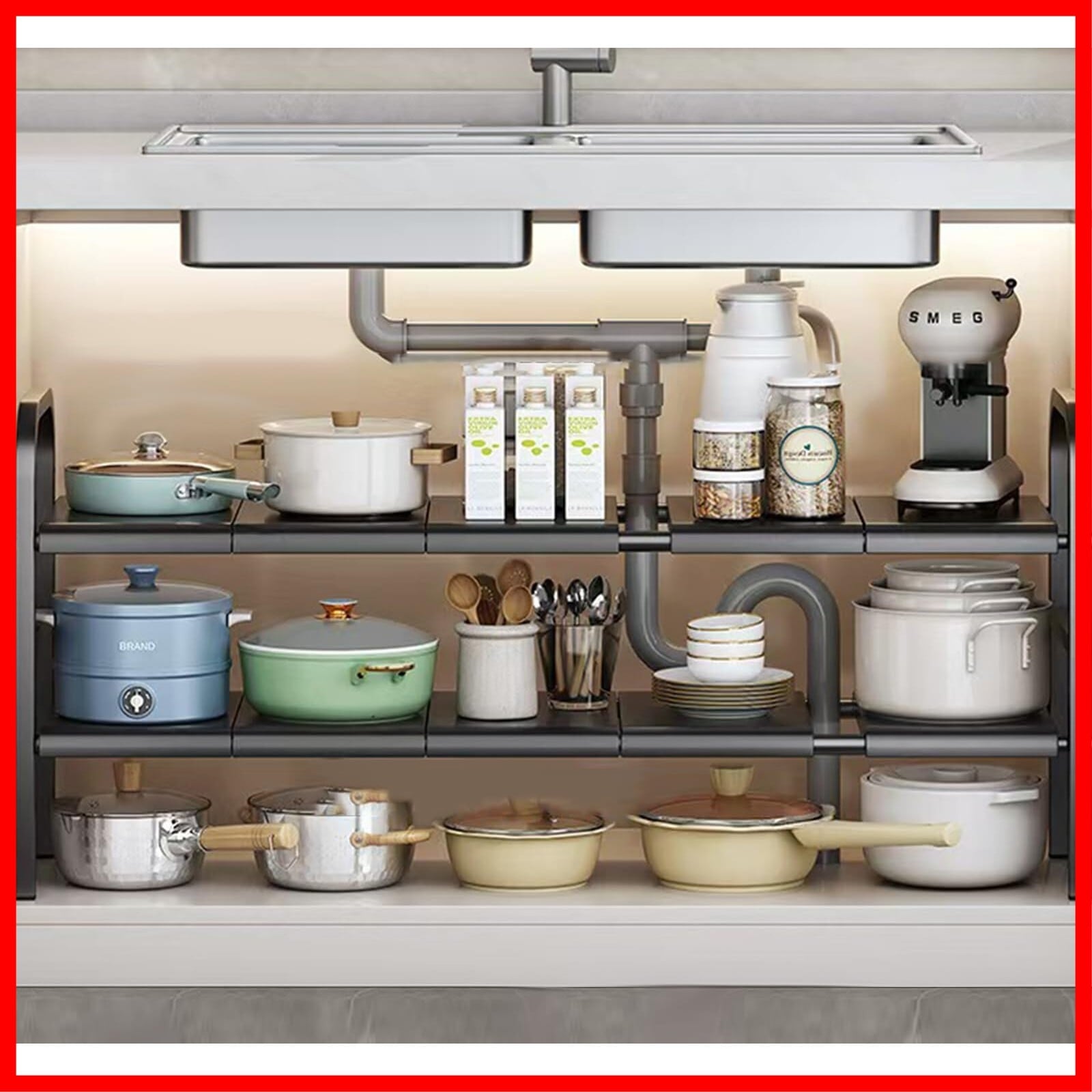 キッチンのシンク下を有効活用し、すっきりとした空間を実現する「シンク下収納ラック」で、整理整頓をお手伝いします!/特徴:この伸縮式収納ラックは、横幅が調整可能で、シンク下や洗面台下にも最適なサイズにフィット。2段の収納スペースと棚板が10枚付属していて、さまざまなアイテムを効率よく収納できます。