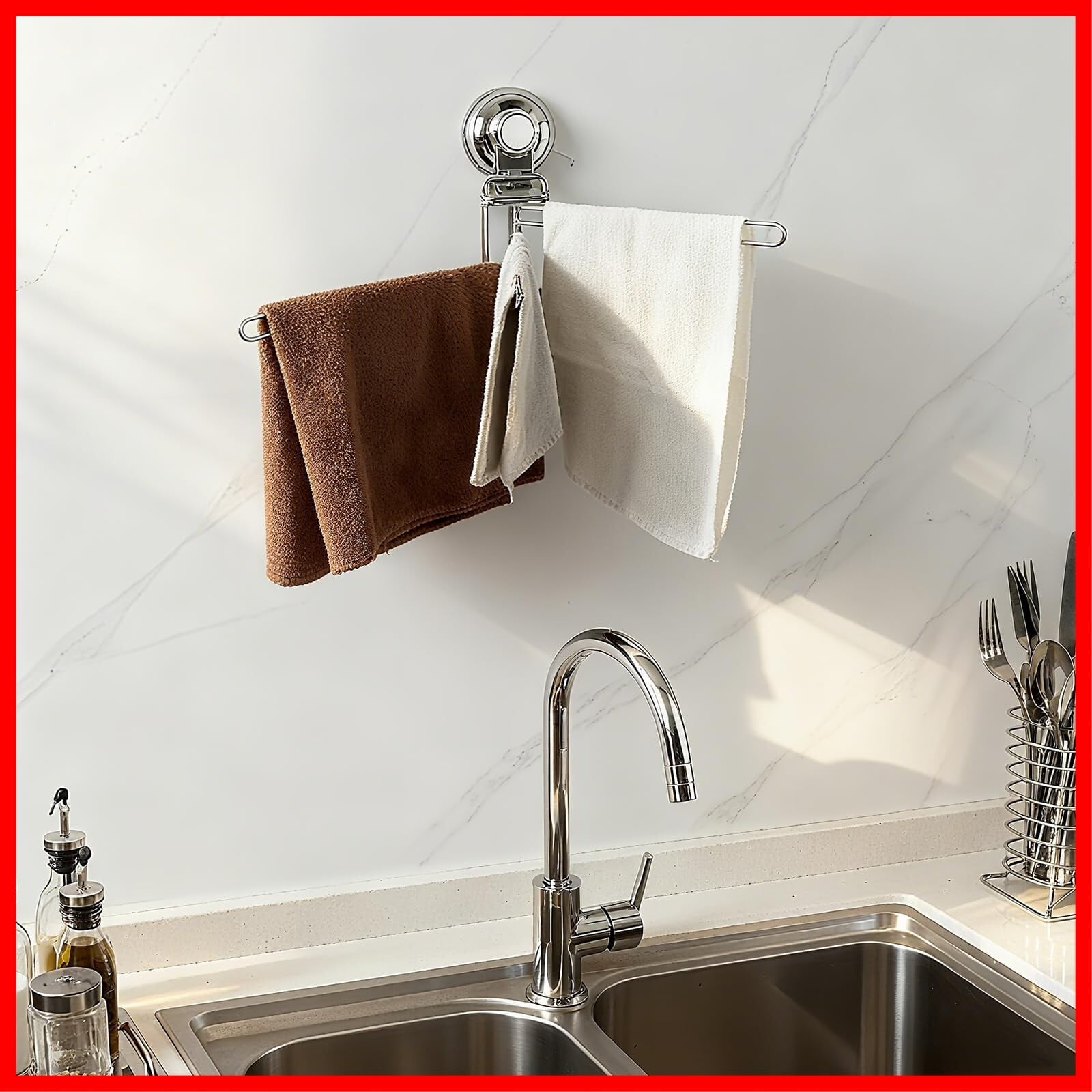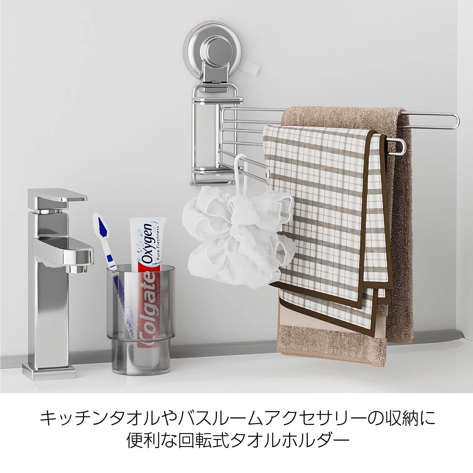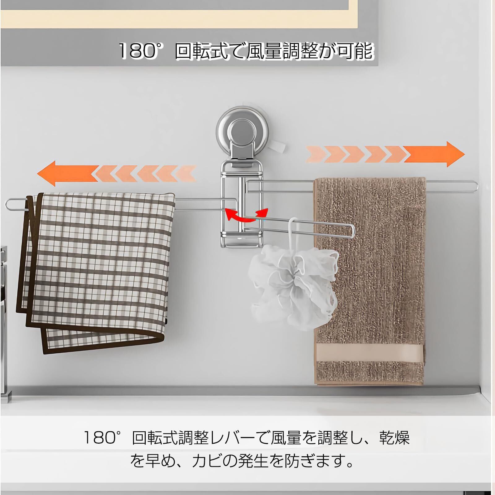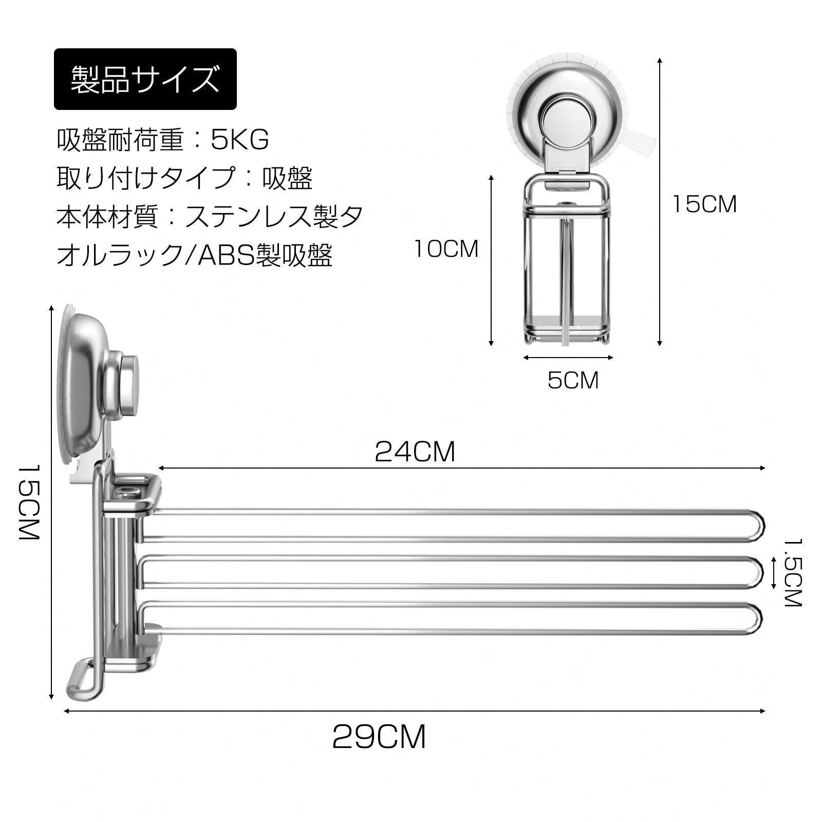 【180°自由回転】 - 各タオルバーは180°回転し、タオル同士の直接接触を防ぎ、清潔で衛生的な状態を保ちます。304ステンレススチールは湿気の多い場所でも腐食に強く、ABS吸盤は熱や湿気にも強く、長時間しっかりと固定します。