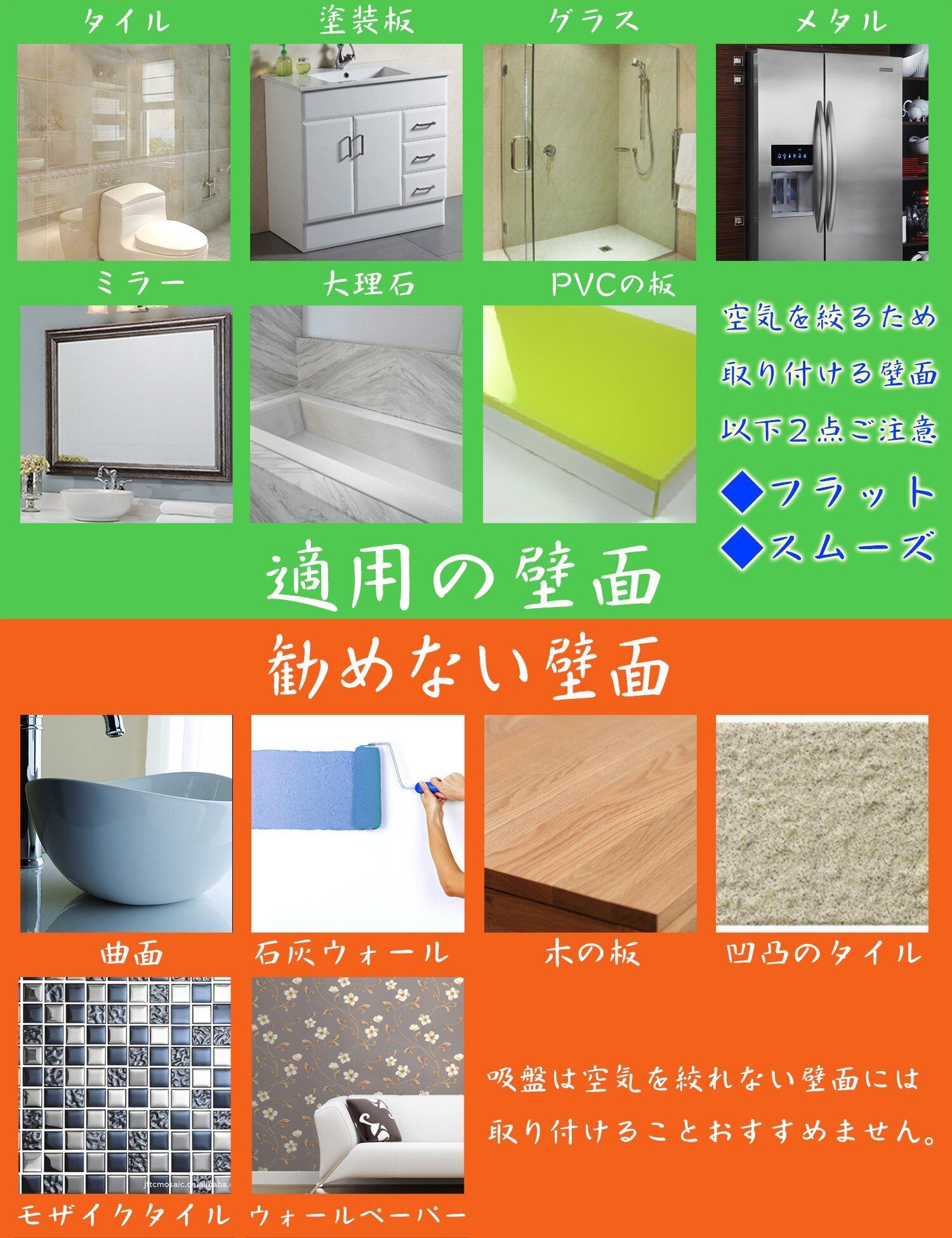 特別な道具や材料は不要で、取り付けも簡単です。滑らかな壁面やタイルにスムーズに付けられ、賃貸住宅でも安心して使用できます。場所を選ばず、キッチンやバスルームに最適なアイテムです。