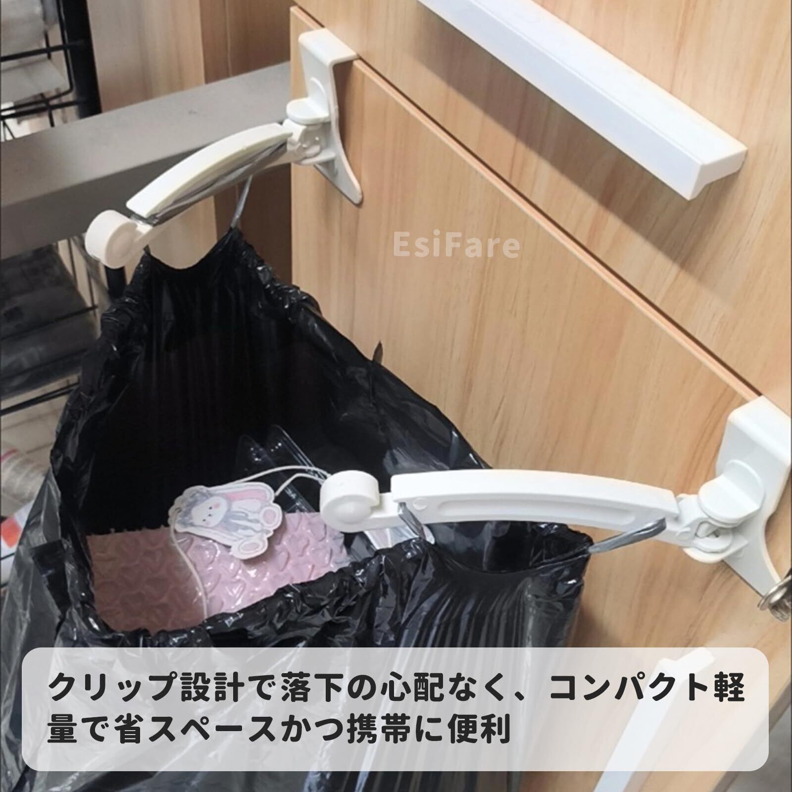 【耐久性】このゴミ箱 フックは高品質な素材を使用し、安定性、耐摩耗性、折りたたみ収納可能などの特徴を備えており、製品の寿命を効果的に延長できます。