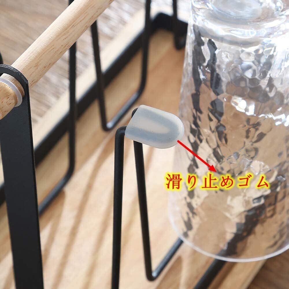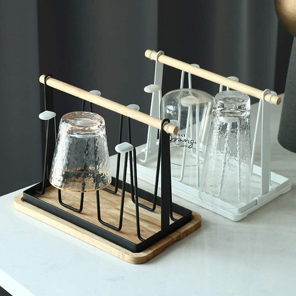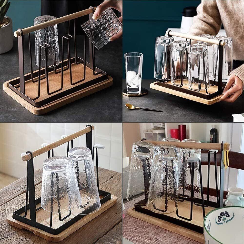 グラススタンド コップスタンドグラスホルダー水切り コップ6個掛け滑り止め付き木製ハンドルおしやれ 省スペース キッチン収納用 (ブラック, 木製トレー付き)