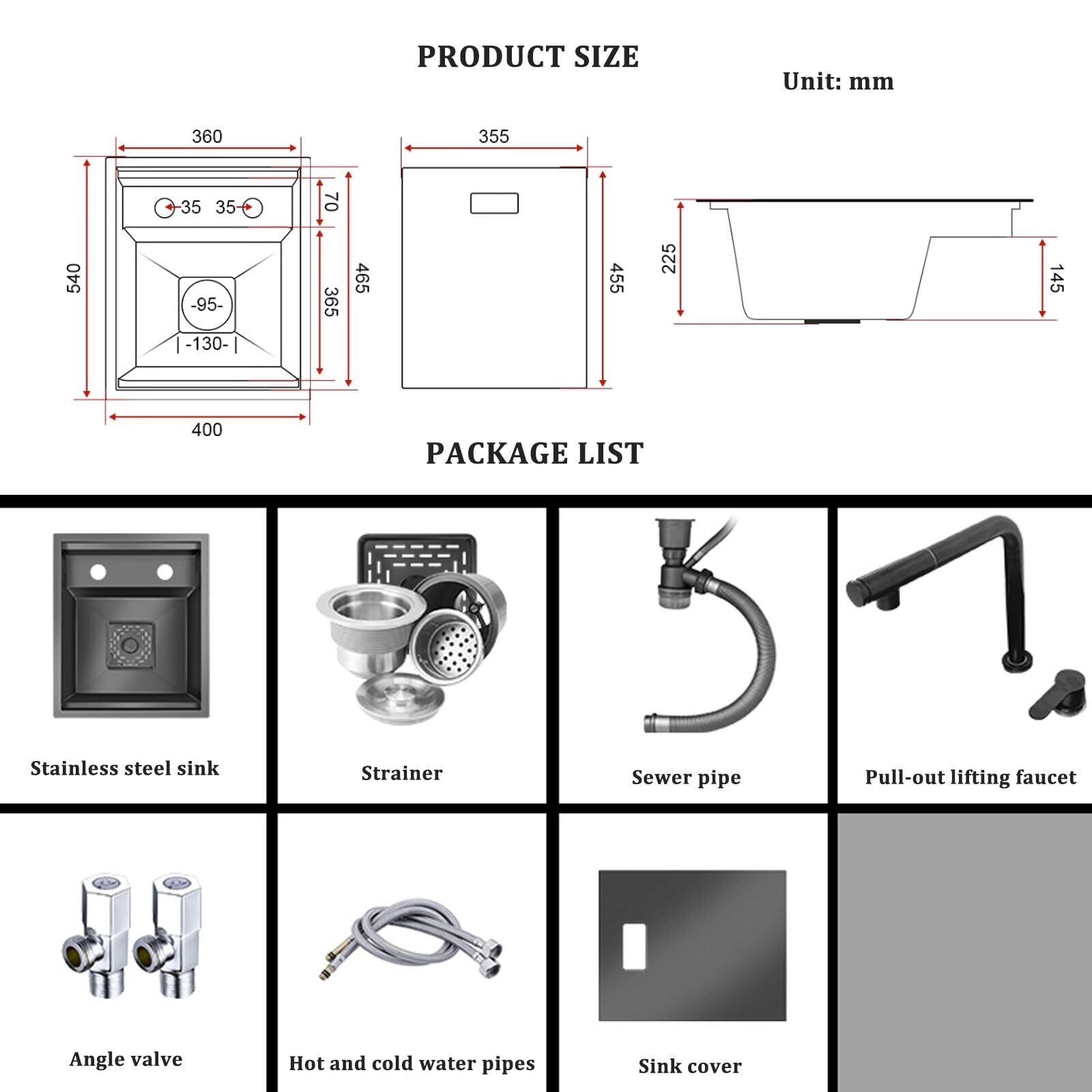●パッキングリスト:ステンレスシンク、ストレーナー、下水道管、引き出し式昇降蛇口、アングルバルブ、温水および冷水パイプ、シンクカバー。