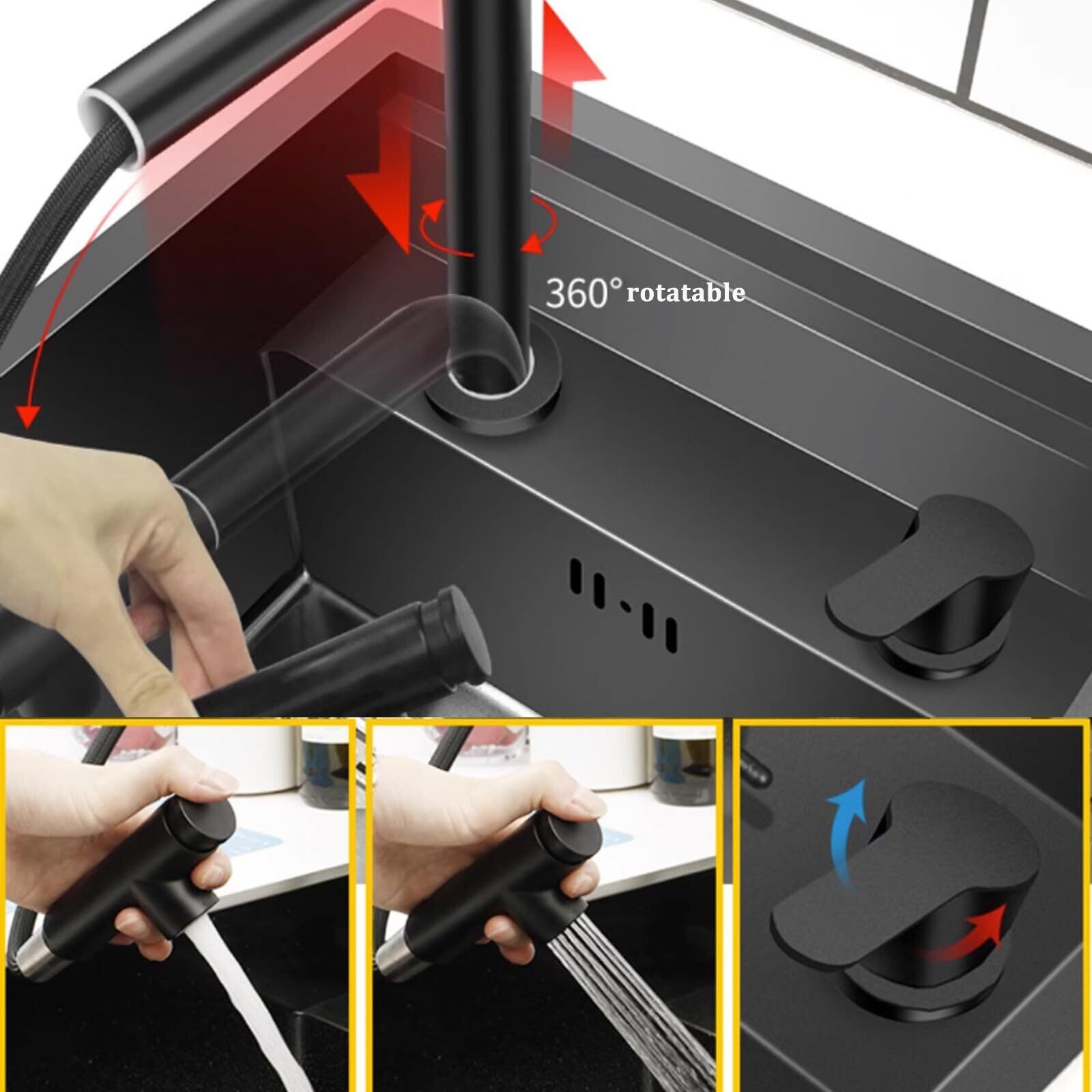 【昇降可能・引き出し可能な蛇口】このシンクの蛇口は上げ下げ、引き出すことができ、360度回転することもできます。 蛇口には独立したハンドルが付いており、お湯と水を調節できます。