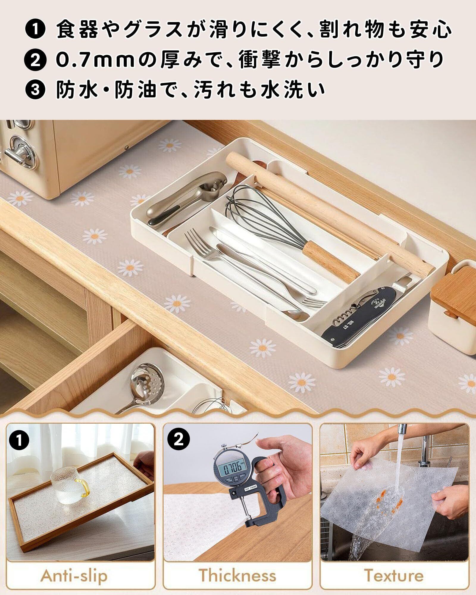 【厚手&滑り止め加工】キッチン シート 棚は美しいエンボス模様で滑り止め効果抜群。食器やグラスが滑りにくく、割れやすいものもしっかり守ります。0.7mmの厚みで、柔軟性と弾力性を兼ね備え、衝撃から家具をしっかりガード。