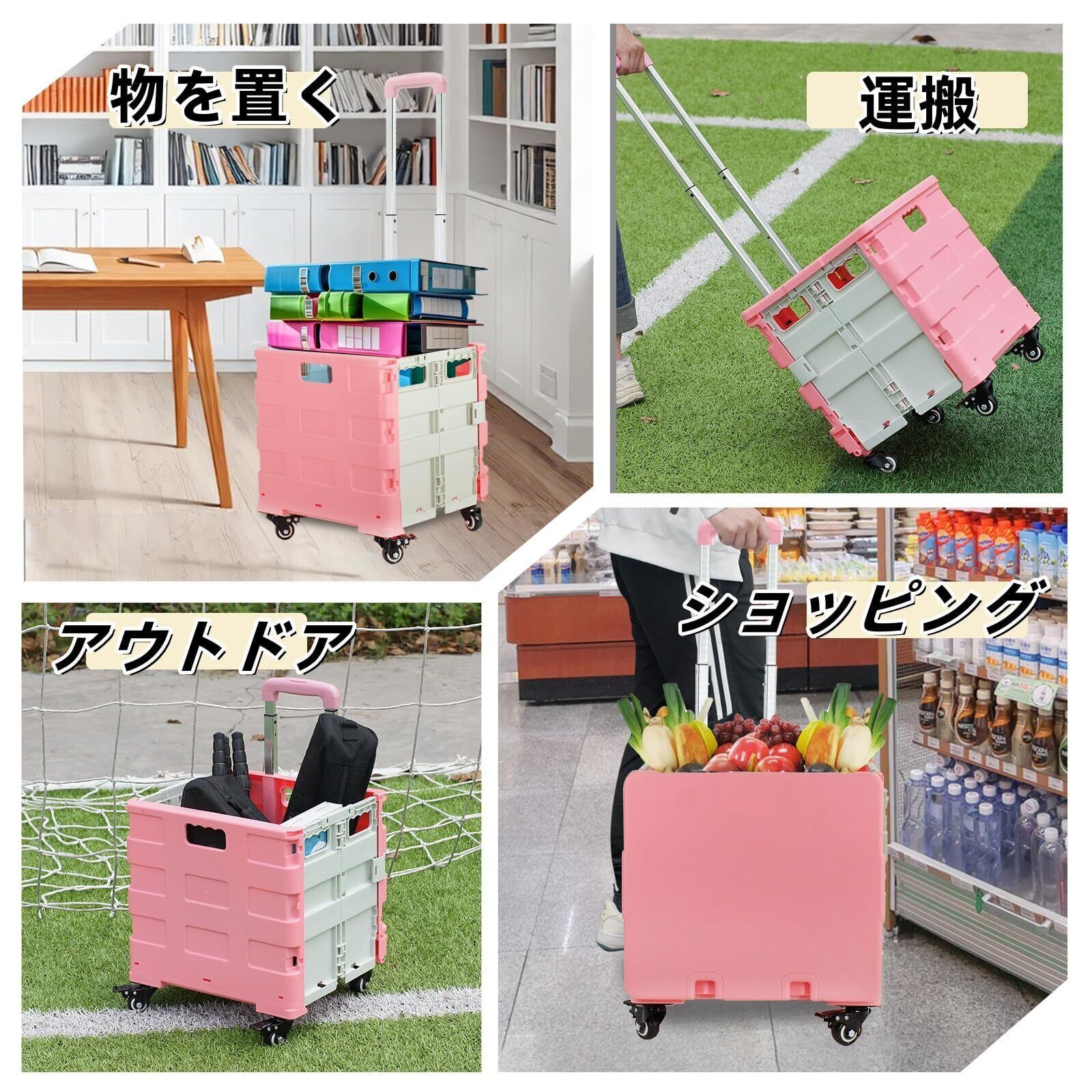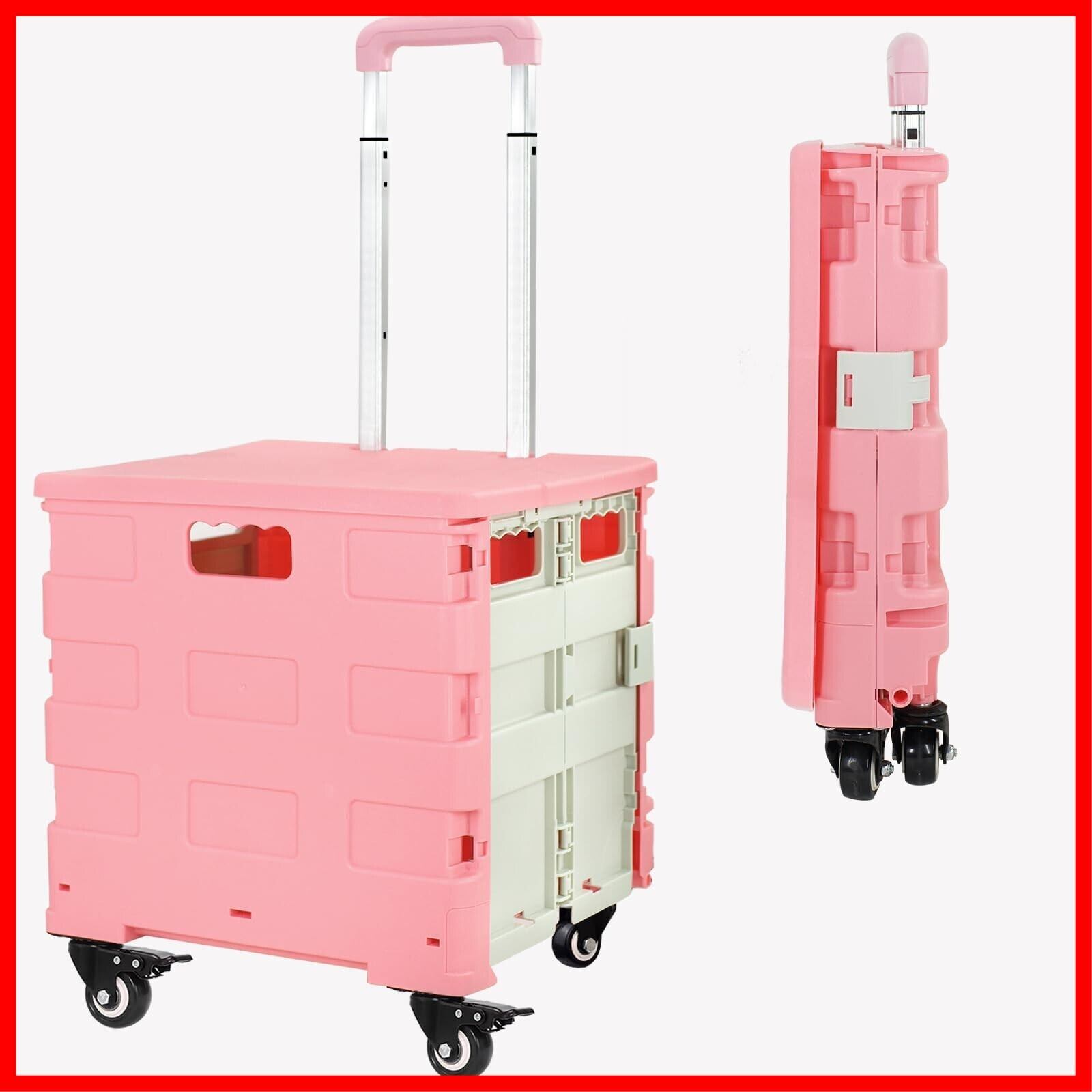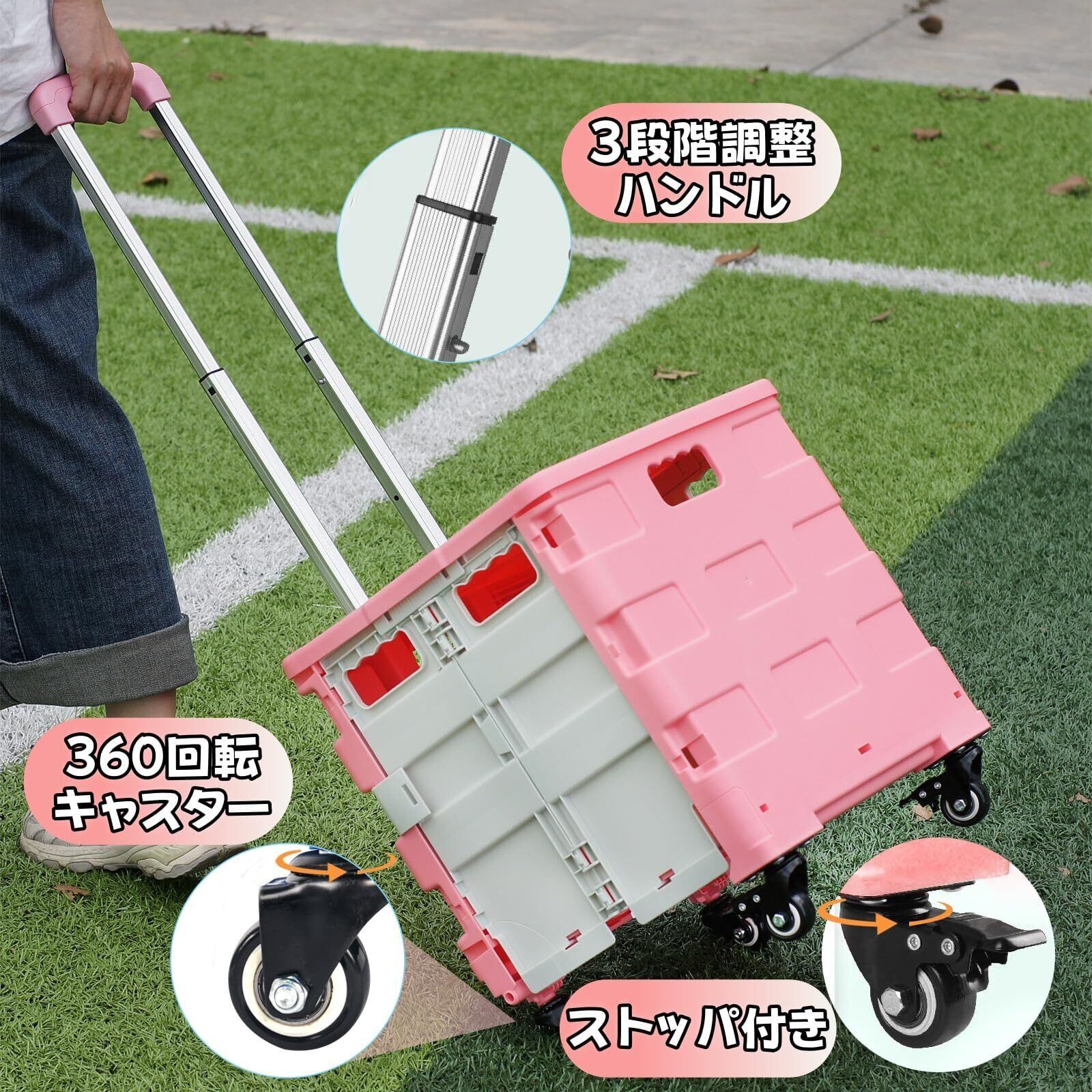 【特価商品】ZHJINGYU ショッピングカート 折りたたみキャリーカート コンテナキャリー 360°回転 4輪静音キャスター ストッパー付き 3段階調整ハンドル 耐荷重25KG 大容量50L (ピンク)