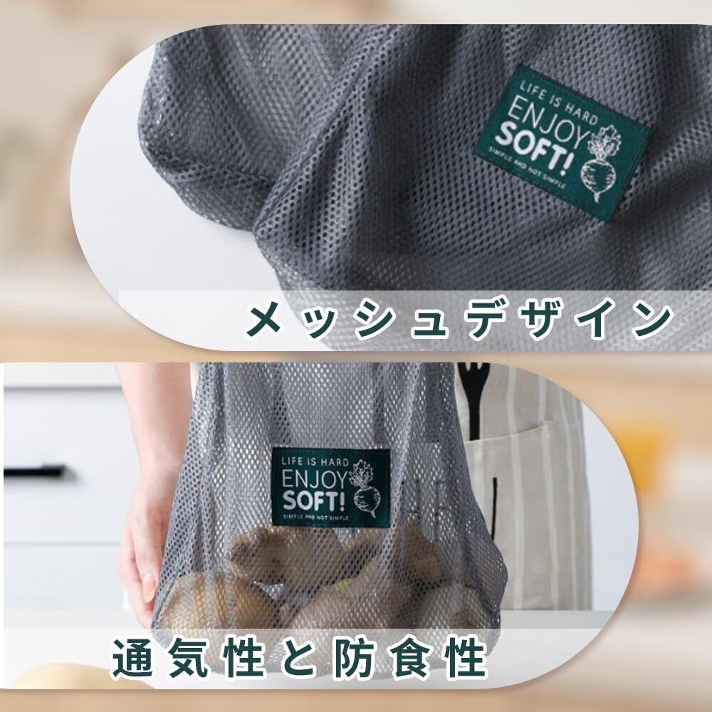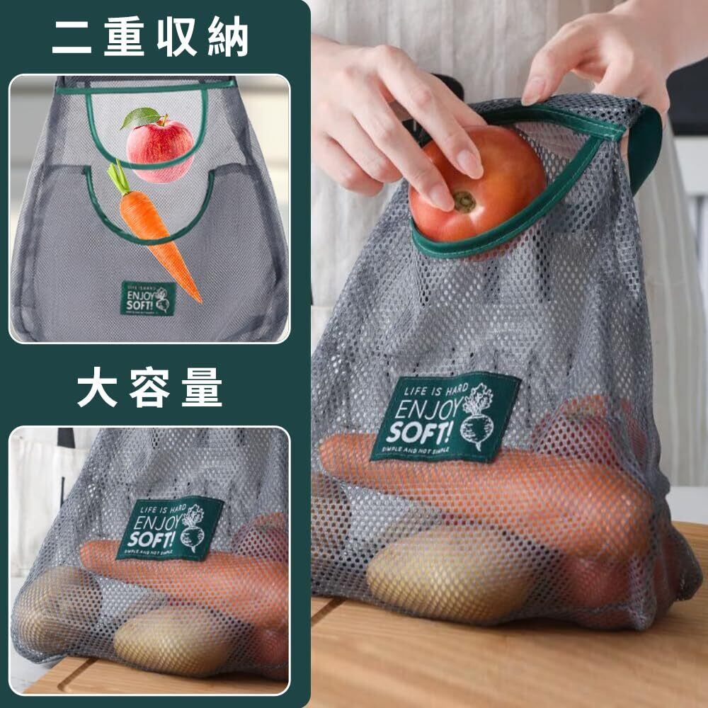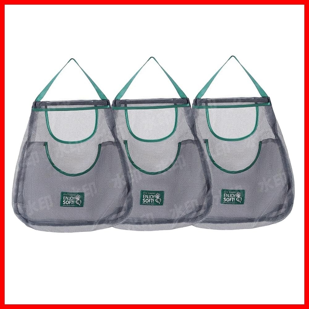 「野菜 吊り下げ 3枚セット」で、お買い物やキッチンの整理をもっとスマートに楽しくしましょう!/特徴:本商品は、野菜や果物を吊り下げて収納できる便利なネットバッグです。ポリ袋も立てて収納可能で、3枚セットで日常使いに最適です。