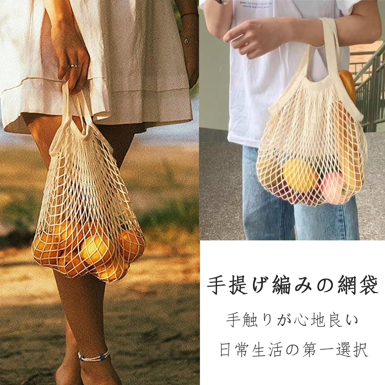このエコバッグは、通気性に優れたメッシュ素材で作られており、果物や野菜の鮮度を保ちながら、おしゃれな見た目も兼ね備えています。シンプルかつ洗練されたデザインで、普段使いからお出かけまで幅広く活用できます。