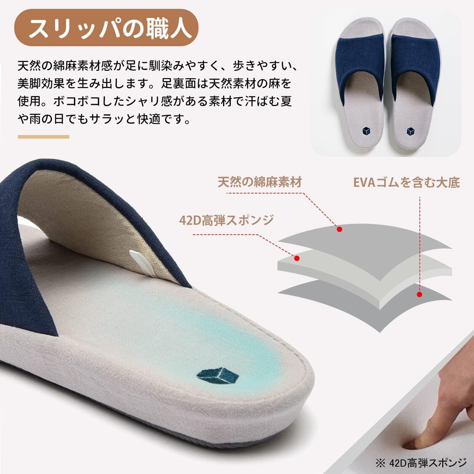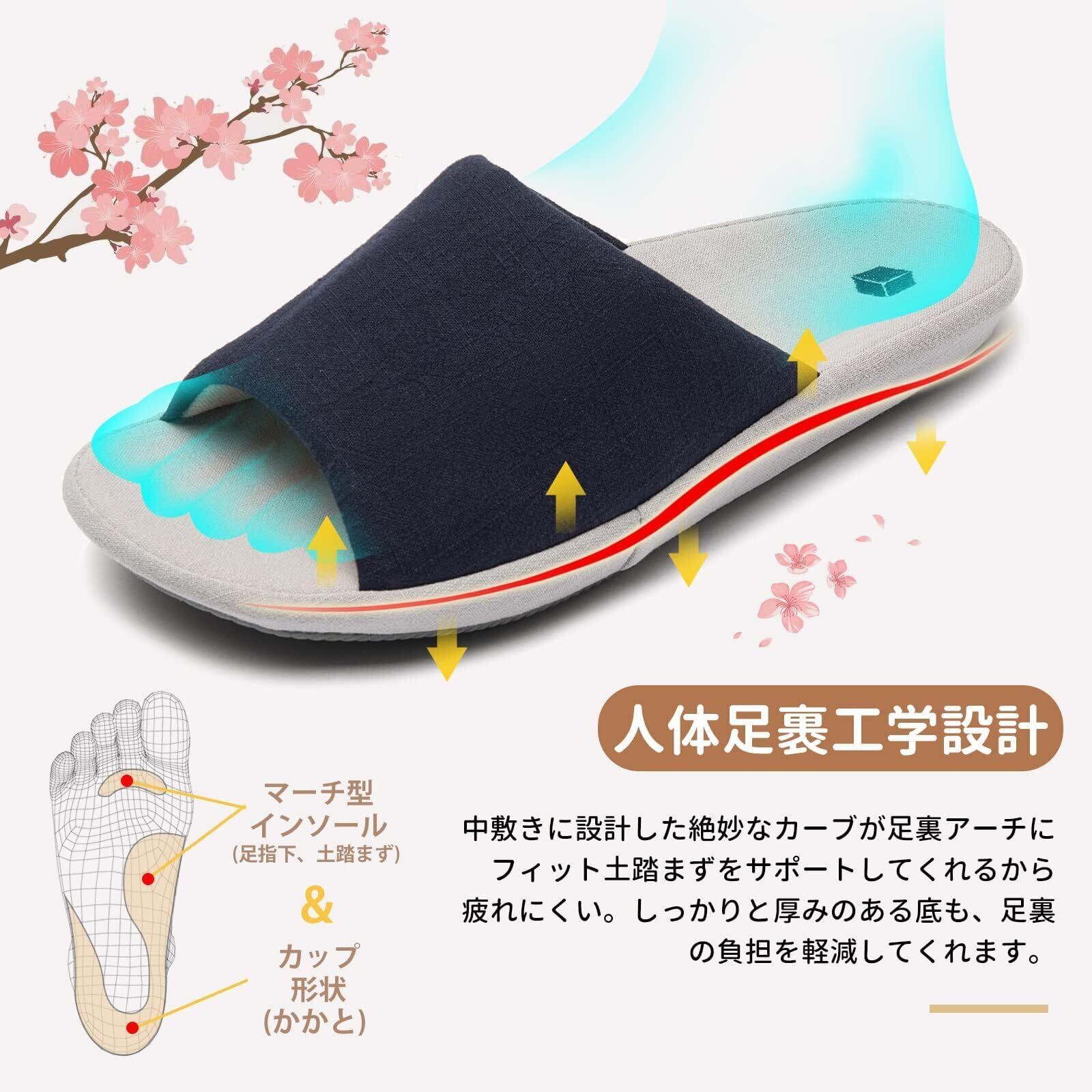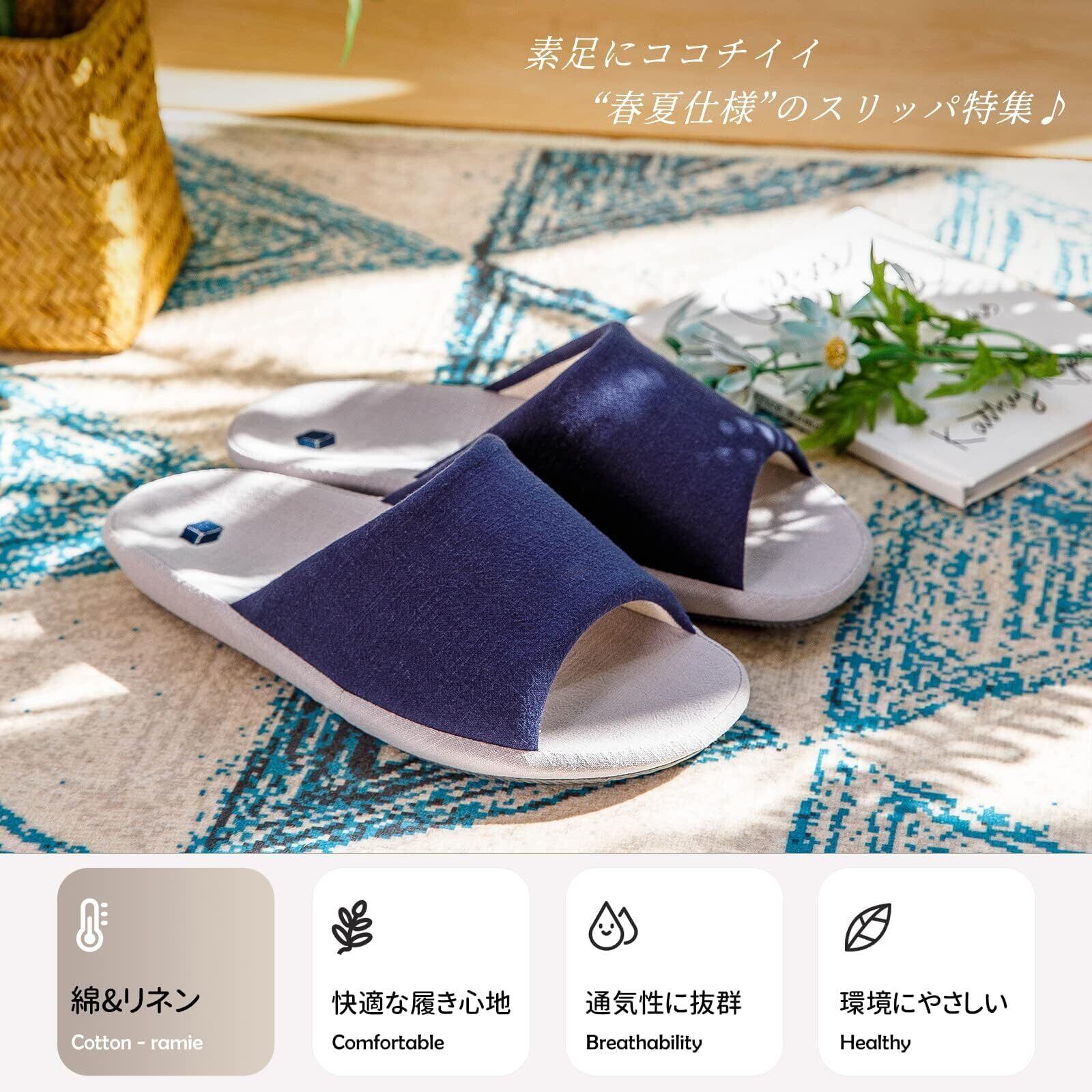 亜麻素材により、足を包み込むような柔らかさを提供します。驚くほど軽量で、素足でも快適にご使用いただけます。春夏のリラックスタイムにぴったりで、長時間履いても疲れにくく、家の中で思う存分リラックスできます。