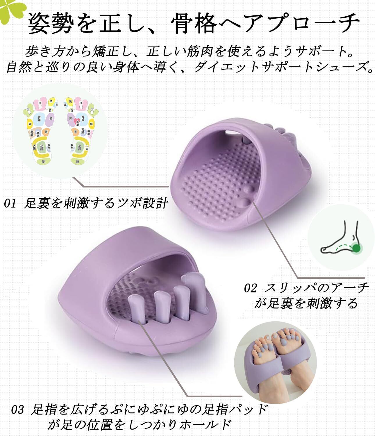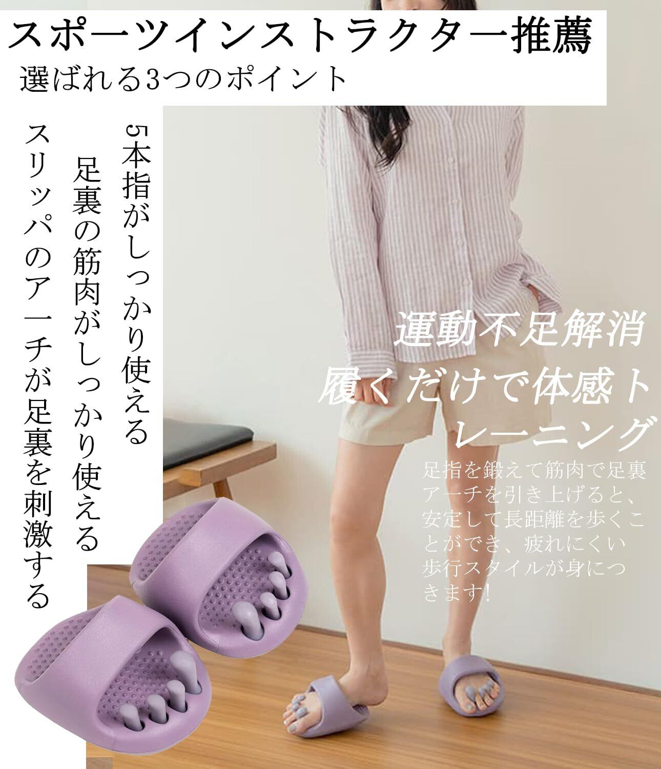 【履くだけ美と健康】健康スリッパ・ツボスリッパ・足のむくみ解消グッズ:ツボにここちよい刺激を与え血行促進、健康な身体づくりを! 1日10分履くだけで足の疲れが緩和されます。むくみを軽減し、すっきりしたラインへ導く。姿勢矯正スリッパ・5本指スリッパ:足指 トレーニングにより、つま先のグリップ力が強化され、足のアーチが安定し、足裏が安定した3点バランスを形成し、腰椎と骨盤矯正して姿勢を改善します。自然と姿勢が整い、立ち姿も歩く姿も美しく。体幹 スリッパ:履くだけで自然に脚やお尻、お腹など普段使わない筋肉に力が入り、その結果、痩せるや足痩せの効果が得られます。ながらトレーニングの最高峰:忙しくても簡単に取り入れられる 履くだけだから、家事や仕事中もOK。