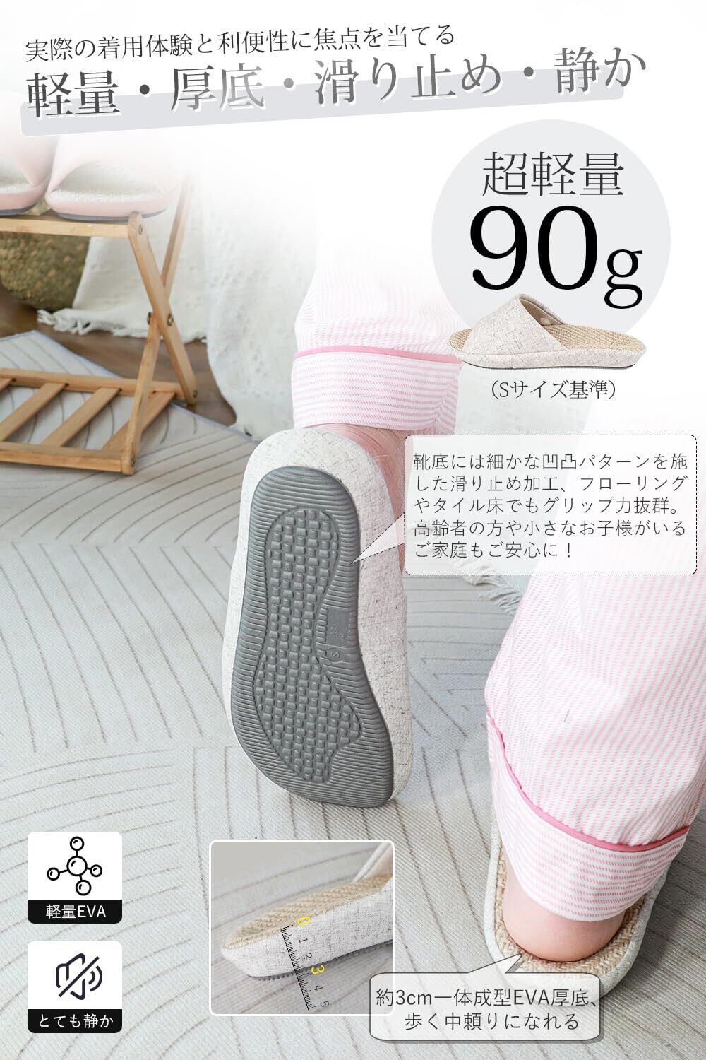 滑り止め機能がついたソールは、安全な歩行をサポートします。自宅での使用はもちろん、来客時にも安心して履けるアイテムです。どんなシーンでも安心してお過ごしいただけます。