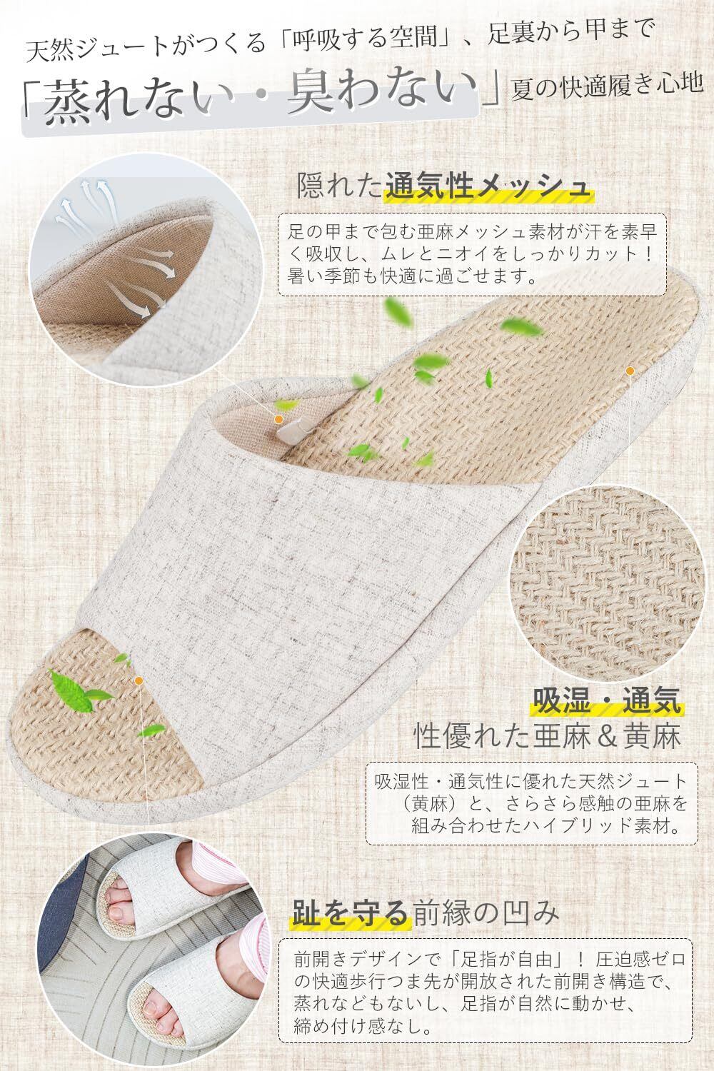 天然素材の黄麻は、優れた通気性を確保し、夏でも蒸れずに快適な履き心地を実現します。軽量設計で、長時間履いていても疲れにくく、リラックスタイムにも最適です。