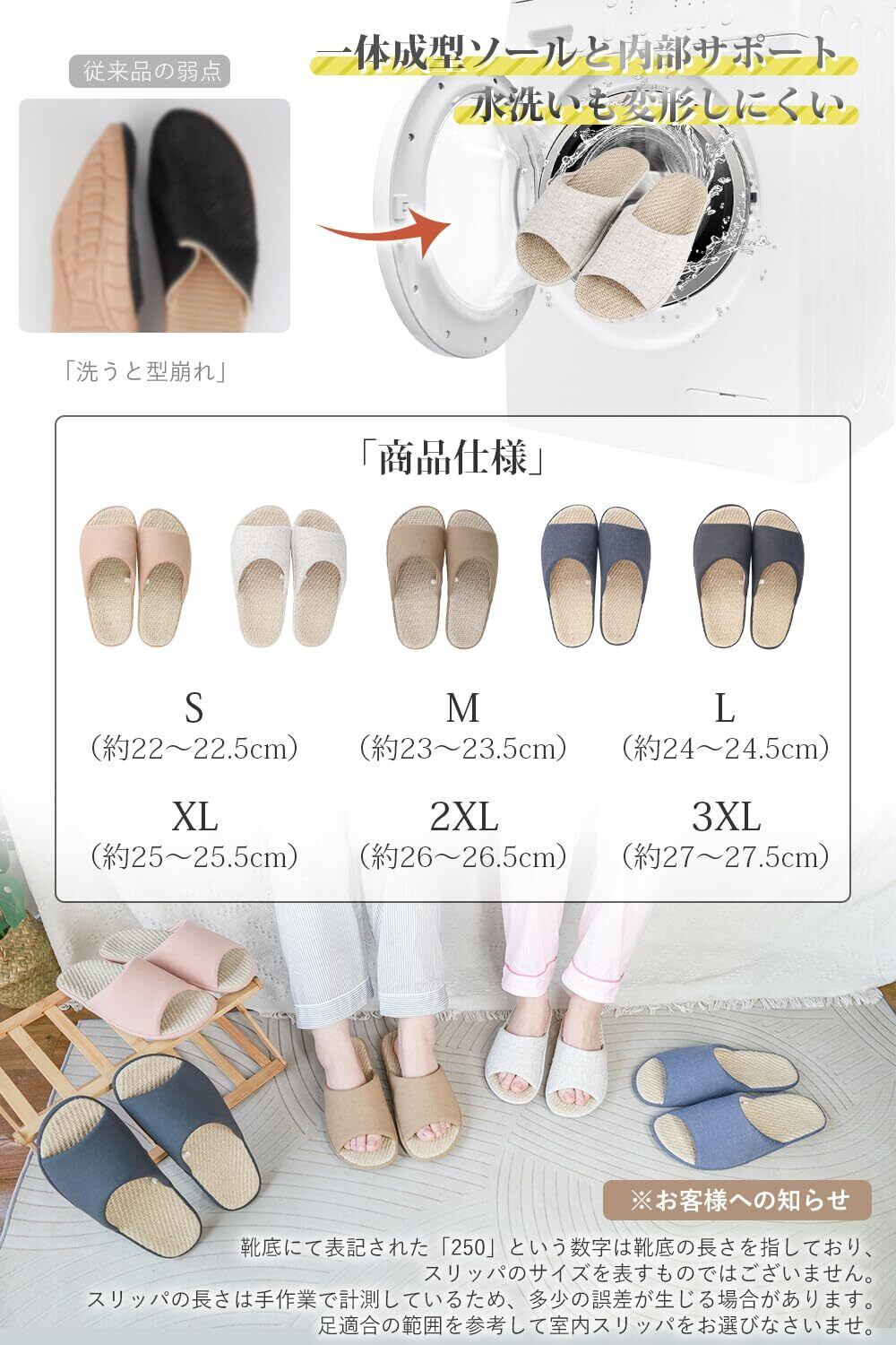 【履き心地&耐久性改良!天然黄麻×亜麻、レーディスもメンズも楽しむ和風夏用スリッパ】「商品仕様のご注意」靴底にて表記された「235・245・250・260・270・280mm」という数字は靴底の長さを指しており、スリッパのサイズを表すものではございません。※6つのサイズあり、足適合の範囲:S(約22~22.5cm)M(約23~23.5cm)L(約24~24.5cm)XL(約25~25.5cm)2XL(約26~26.5cm)3XL(約27~27.5cm)※お客様への知らせ:スリッパの長さは手作業で計測しているため、多少の誤差が生じる場合があります。足適合の範囲を参考して室内スリッパをお選びなさいませ。「商品素材」アッパー:リンネ インソール:黄麻&リンネ ソール:EVA