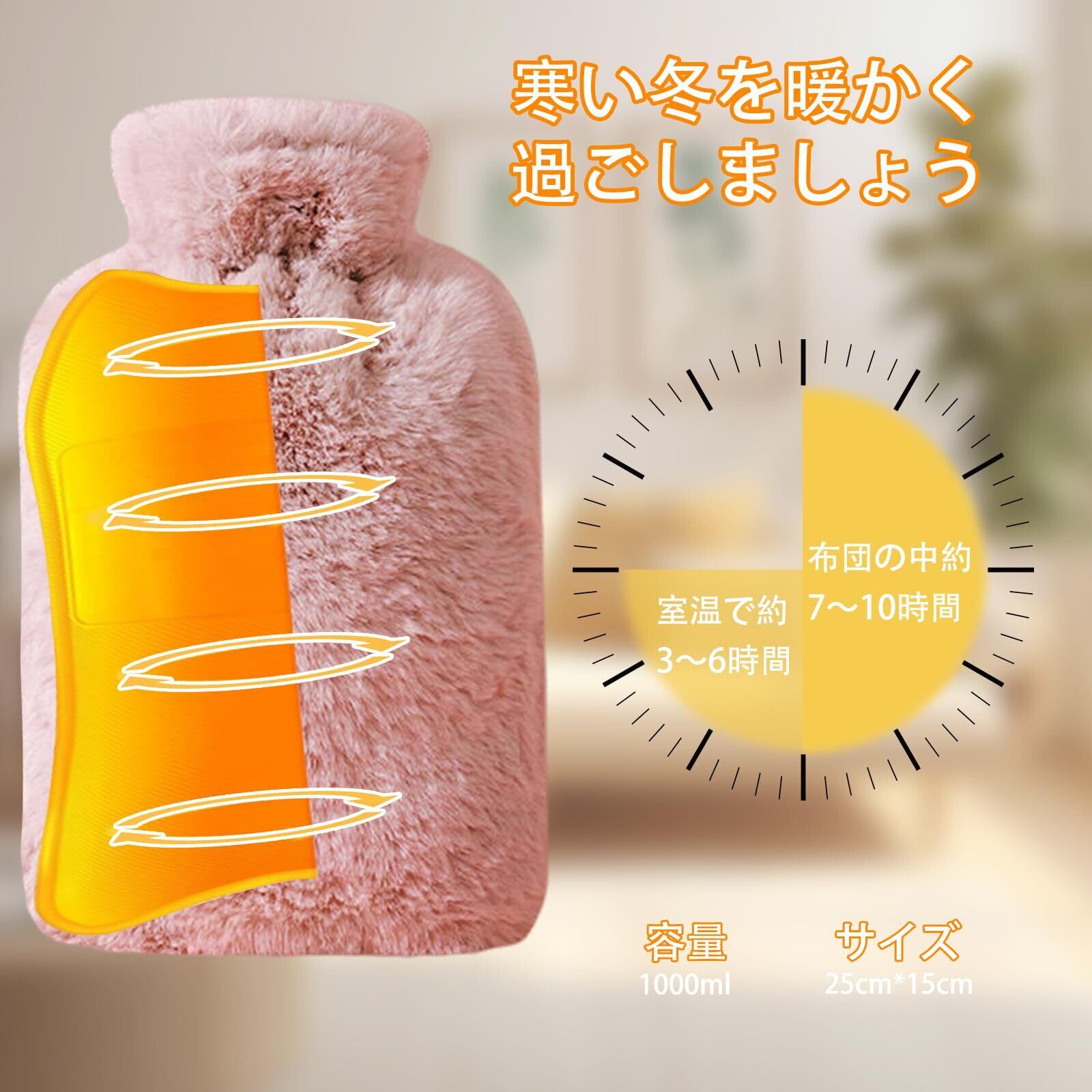 「この湯たんぽで、冬の寒さを心地よく乗り越えましょう!」/特徴:可愛いピンクのデザインが目を引くこの湯たんぽは、1リットルの適度な容量で、しっかりとした温かさを提供します。注水式の機能により、手軽に使え、電気不要なので省エネもバッチリです。