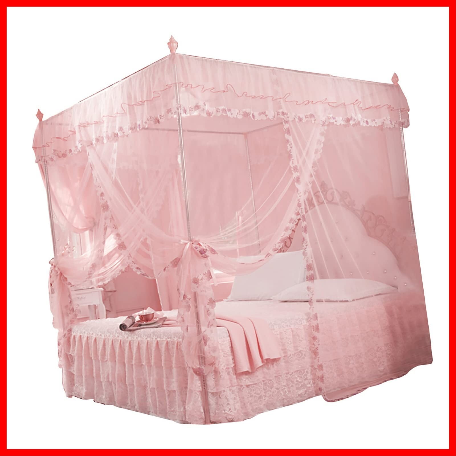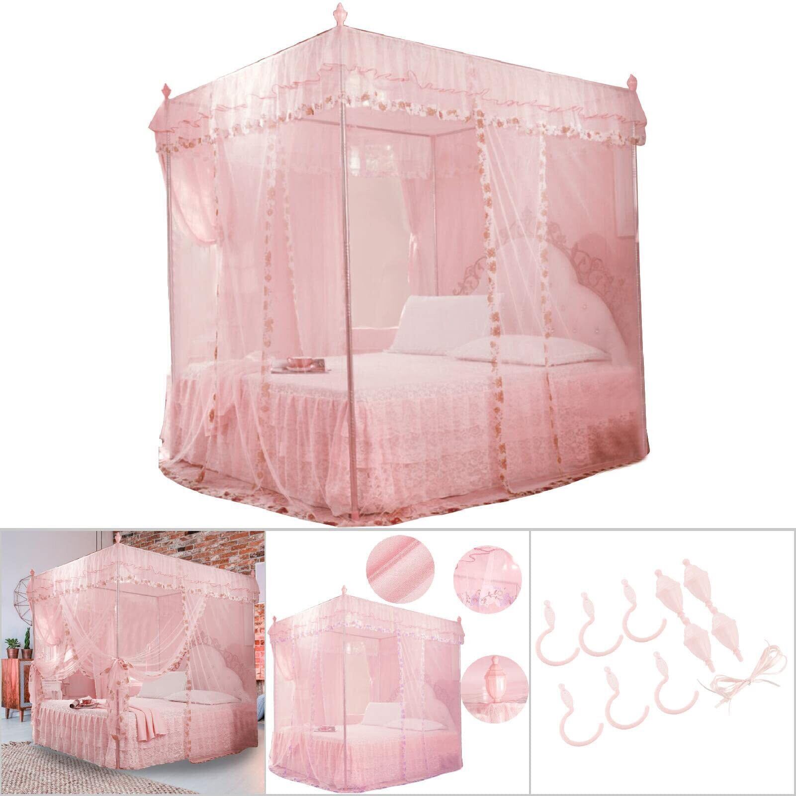 【特価商品】蚊帳 天蓋付きベッド 四隅蚊帳 丈夫 カーテン お姫様ベッド 装飾 耐久性 通気性 可愛い 洗濯可能 実用 寝室 ベッドルーム(ピンクL)