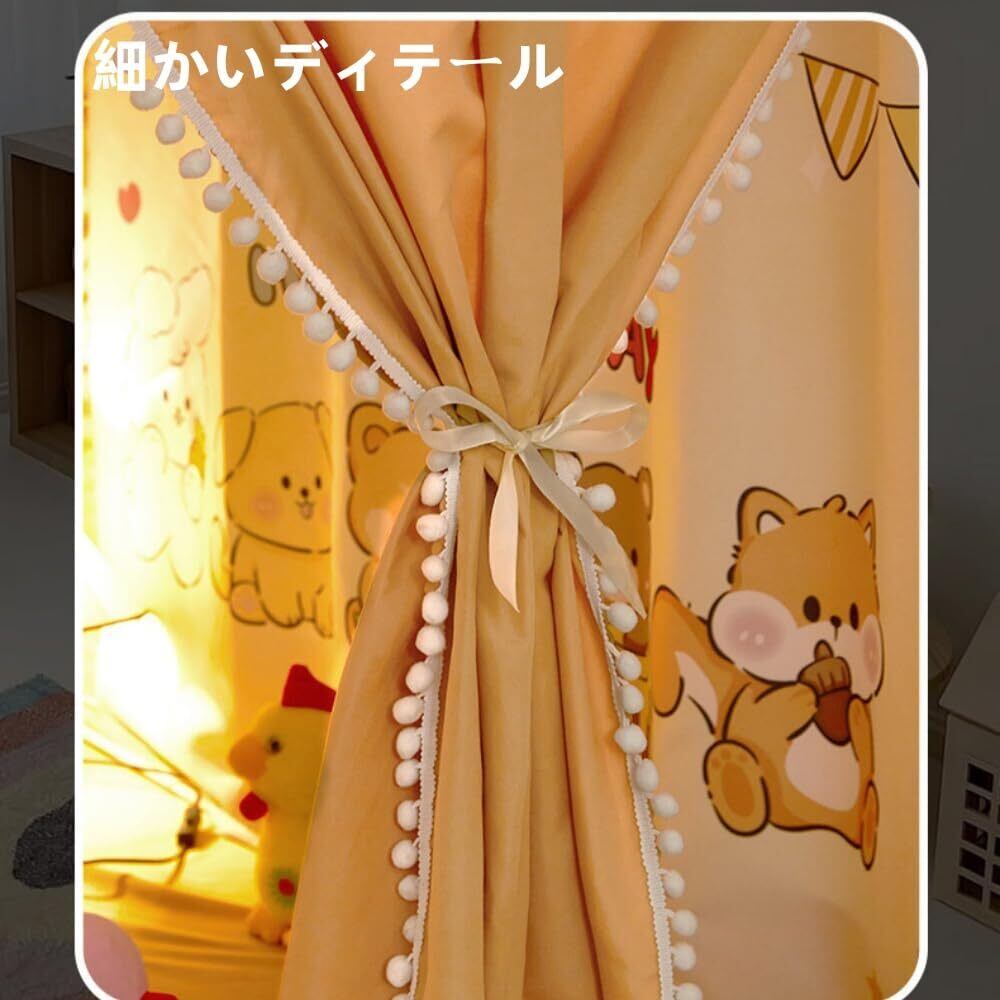鮮やかなイエローの色合いが子供部屋を明るく演出し、遊び心をくすぐります。かわいらしいデザインは、お部屋のインテリアとしても映え、子供たちの大好きな空間を作り上げます。親子で楽しめる楽しい時間を、ぜひこのテントでお楽しみください。