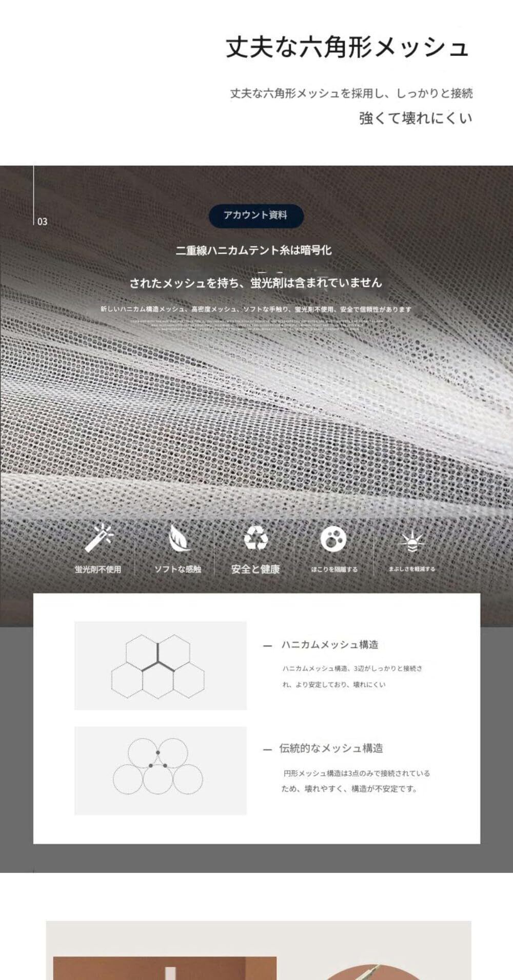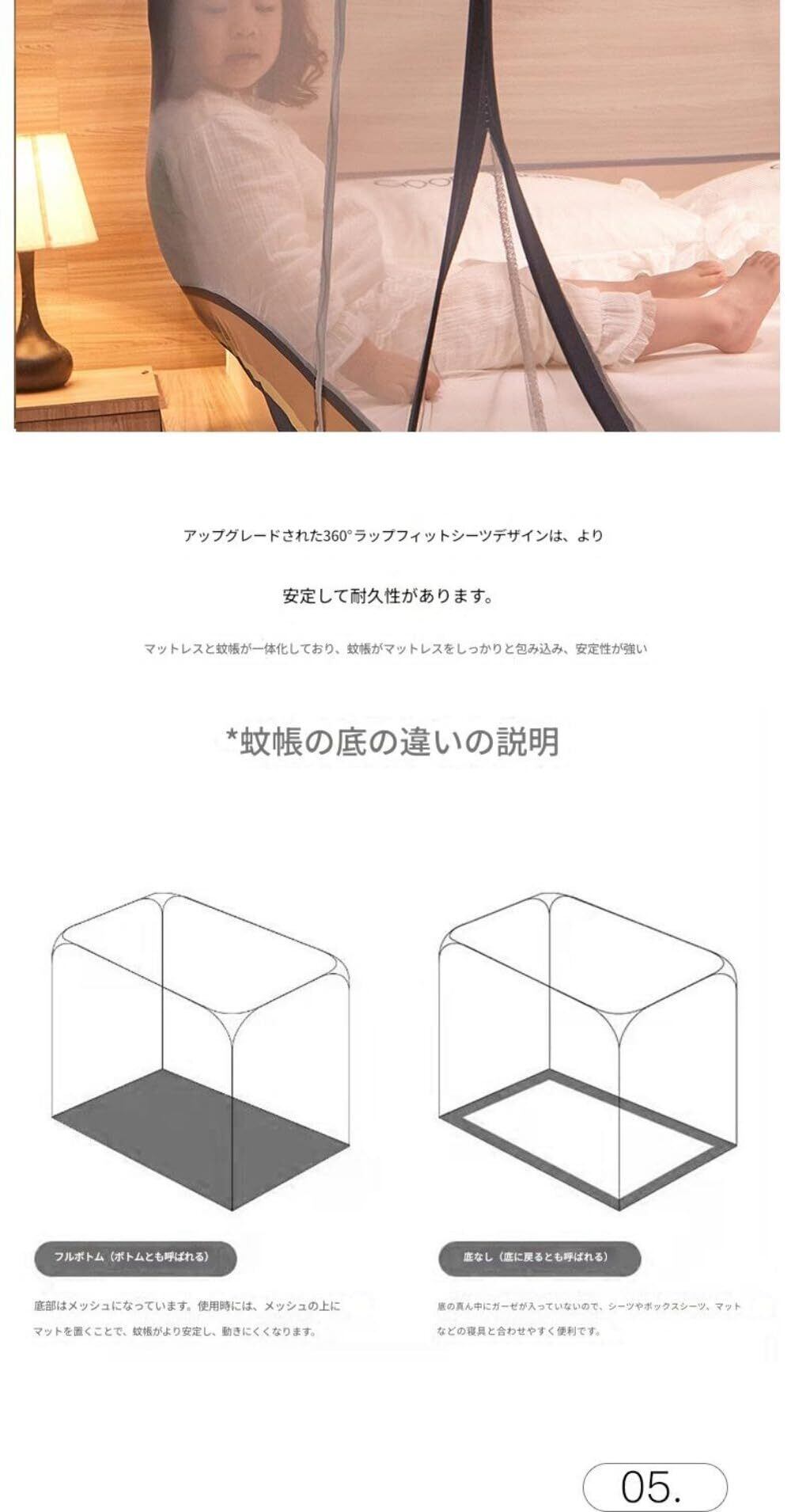 快適な睡眠環境: 蚊や虫などの侵入を完全に防ぎ、心地よい睡眠環境を提供します。 通気性に優れた素材を使用しており、蒸れることなく、快適に過ごせます。
