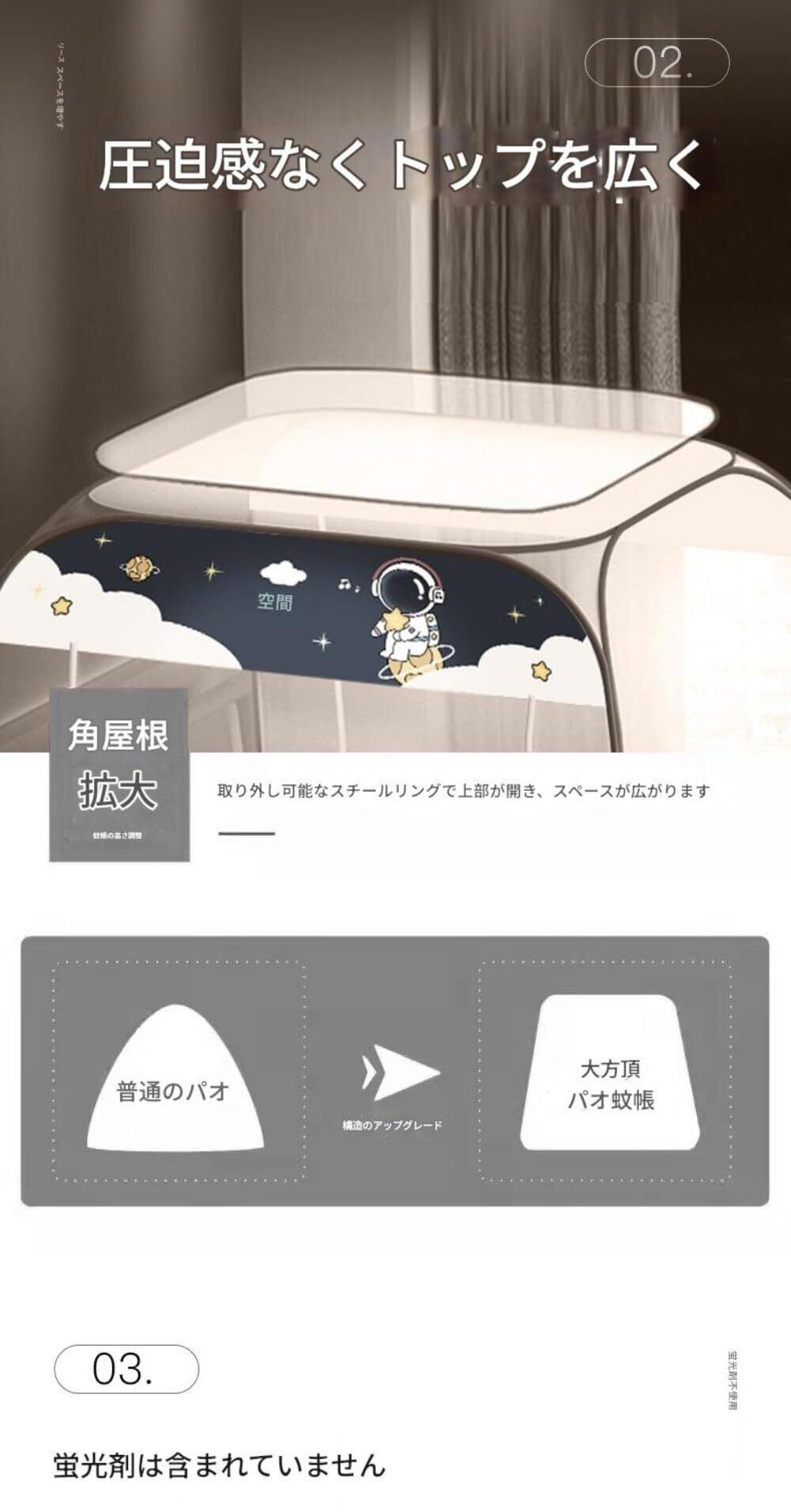 革新的な防落構造: パオ型の独特設計により、従来の蚊帳が必要とする複雑な落下防止装置を不要にしました。 丸みを帯びた形状が自然に床と一体化し、睡眠中の不意の動きでも安心していられます。特に子供や高齢者が快適且つ安全に過ごせる環境を提供します
