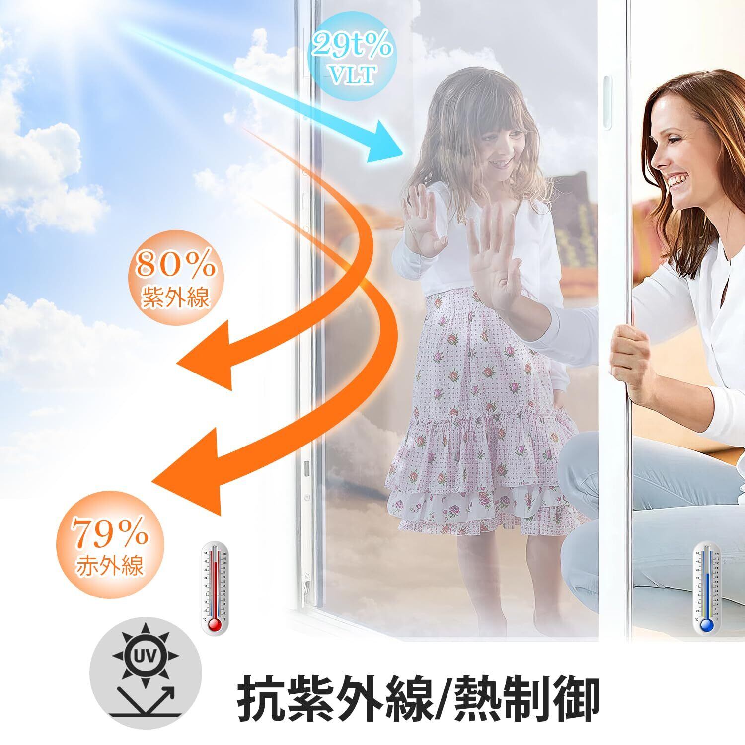 サイズ:30x200cm、特徴:UVカット、飛散防止、水貼り、透明ミラーフィルム
