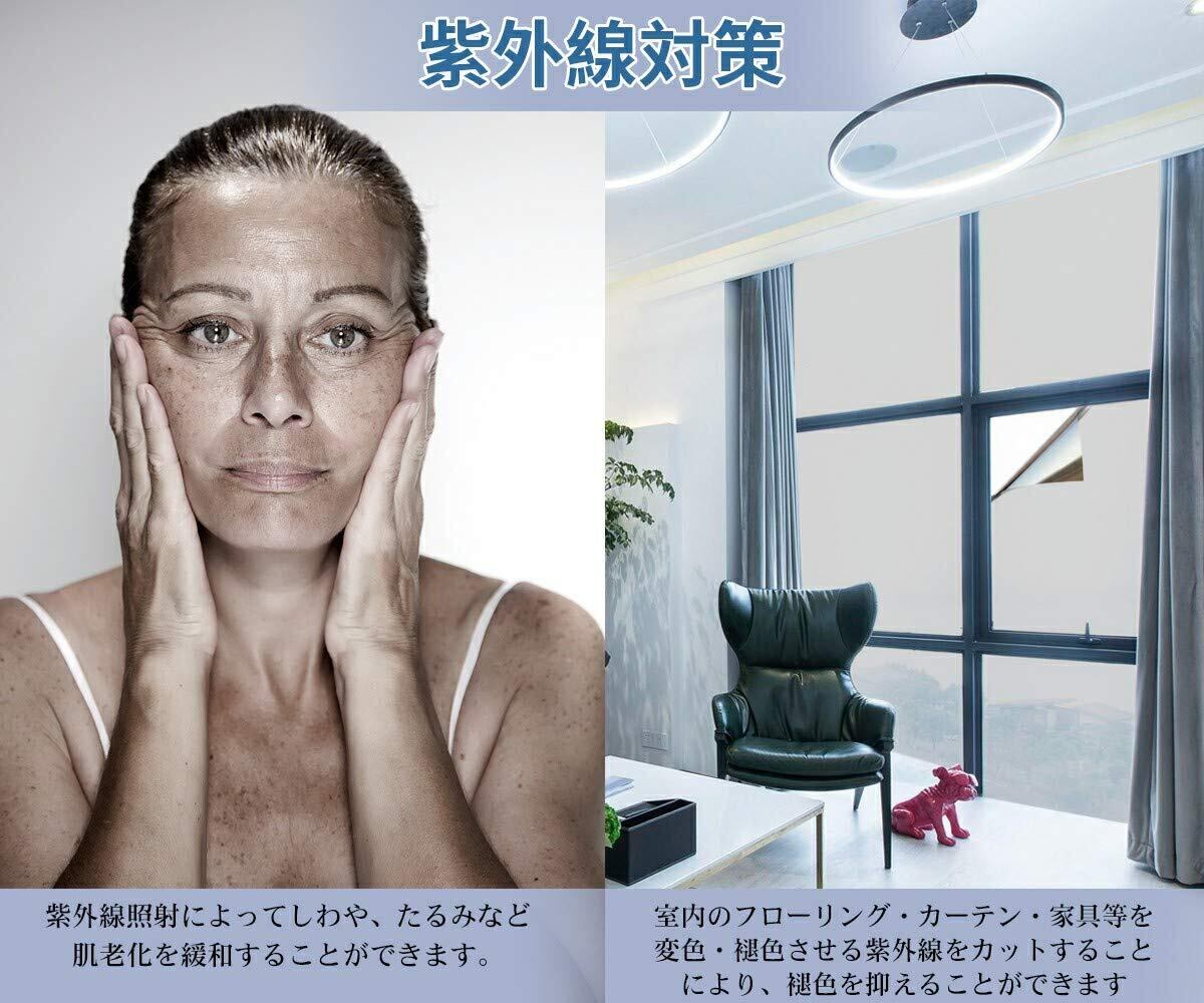 【紫外線85%遮断&家具色褪せ軽減】ガラスを通して室内に入る大量の有害な紫外線を大幅カットできます。眩しい直射日光を和らげて肌を刺すようなジリジリ感などの不快を抜き取り、快適な室内空間を演出します。ローリングや畳、カーペットなどの床材、家具の紫外線による日焼け、変色、劣化も軽減できる効果があります。