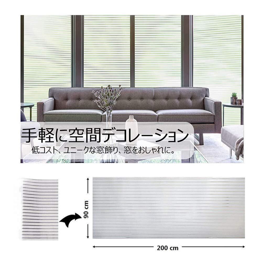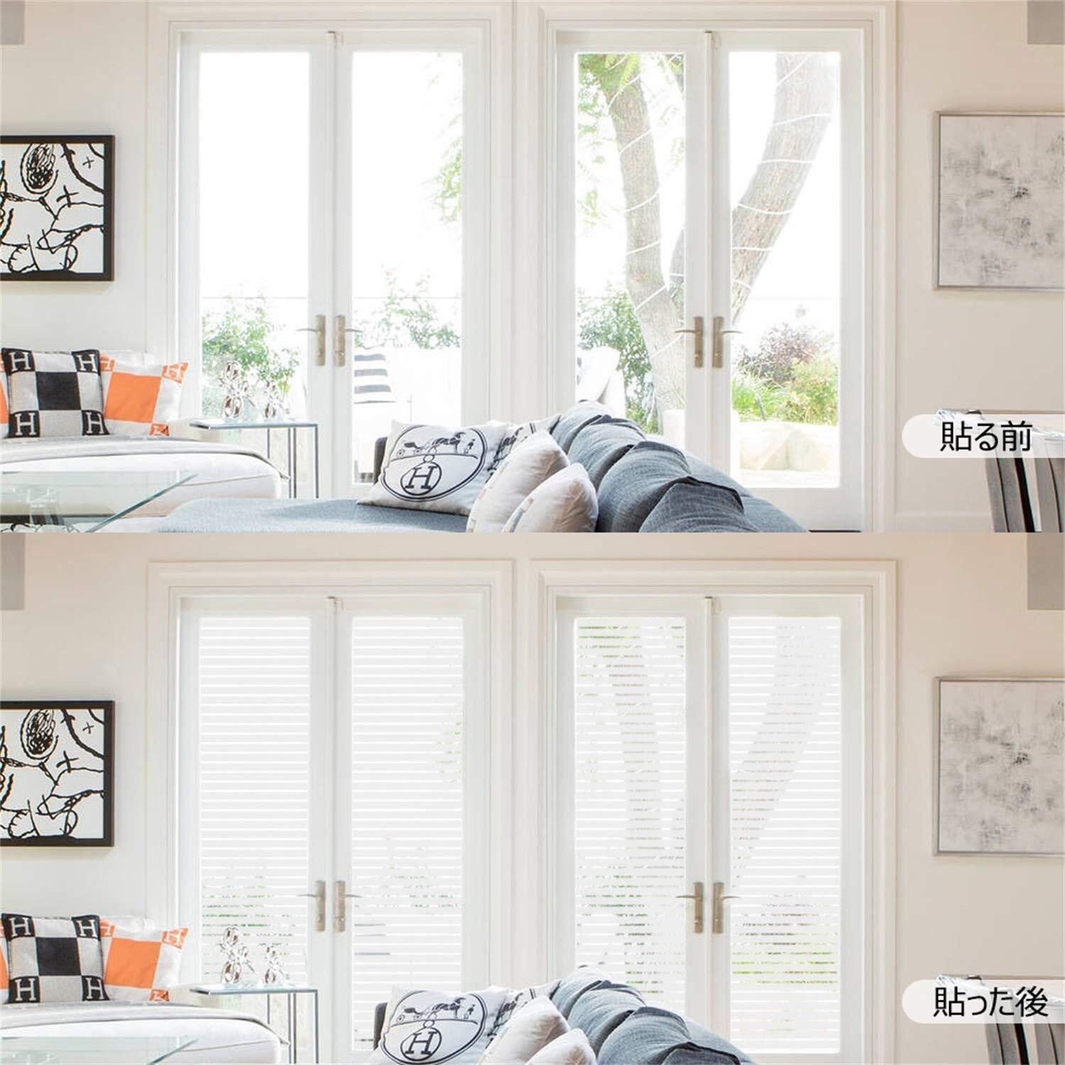 この目隠しシートは、すりガラス調のストライプデザインが施され、視界をしっかり遮断しながらもお部屋の明るさを損ないません。リビングやオフィスでの使用にも最適で、すっきりとした印象を与えます。