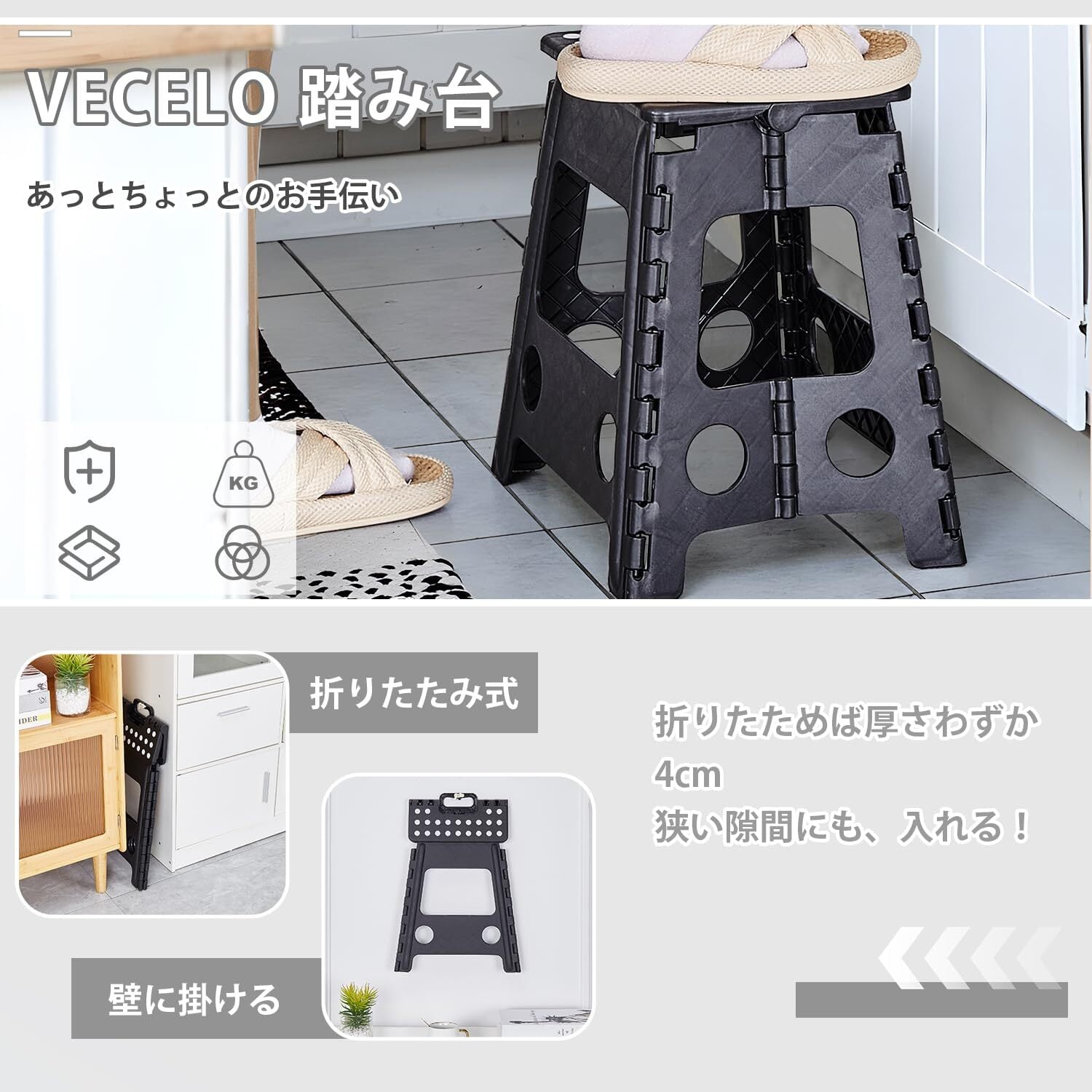「このVECELOの踏み台で、毎日の作業をもっと快適にサポートします!」/特徴:幅39cm、奥行32cm、高さ39cmのコンパクトなサイズで、さまざまなシーンで活躍する折りたたみ式ステップ。シックなブラックカラーは、どんなインテリアにもマッチします。
