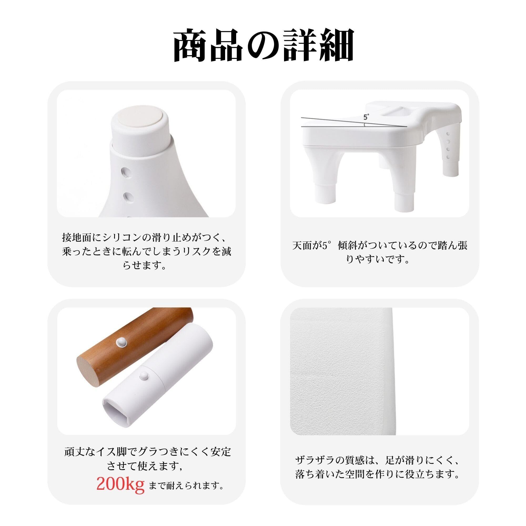 高品質な素材で作られたこの踏み台は、安定した使用感を提供します。滑り止め加工が施された表面やしっかりとした脚部により、子供や高齢者の使用時でも安全に使用できます。トイレへの昇降も、心配無用です。