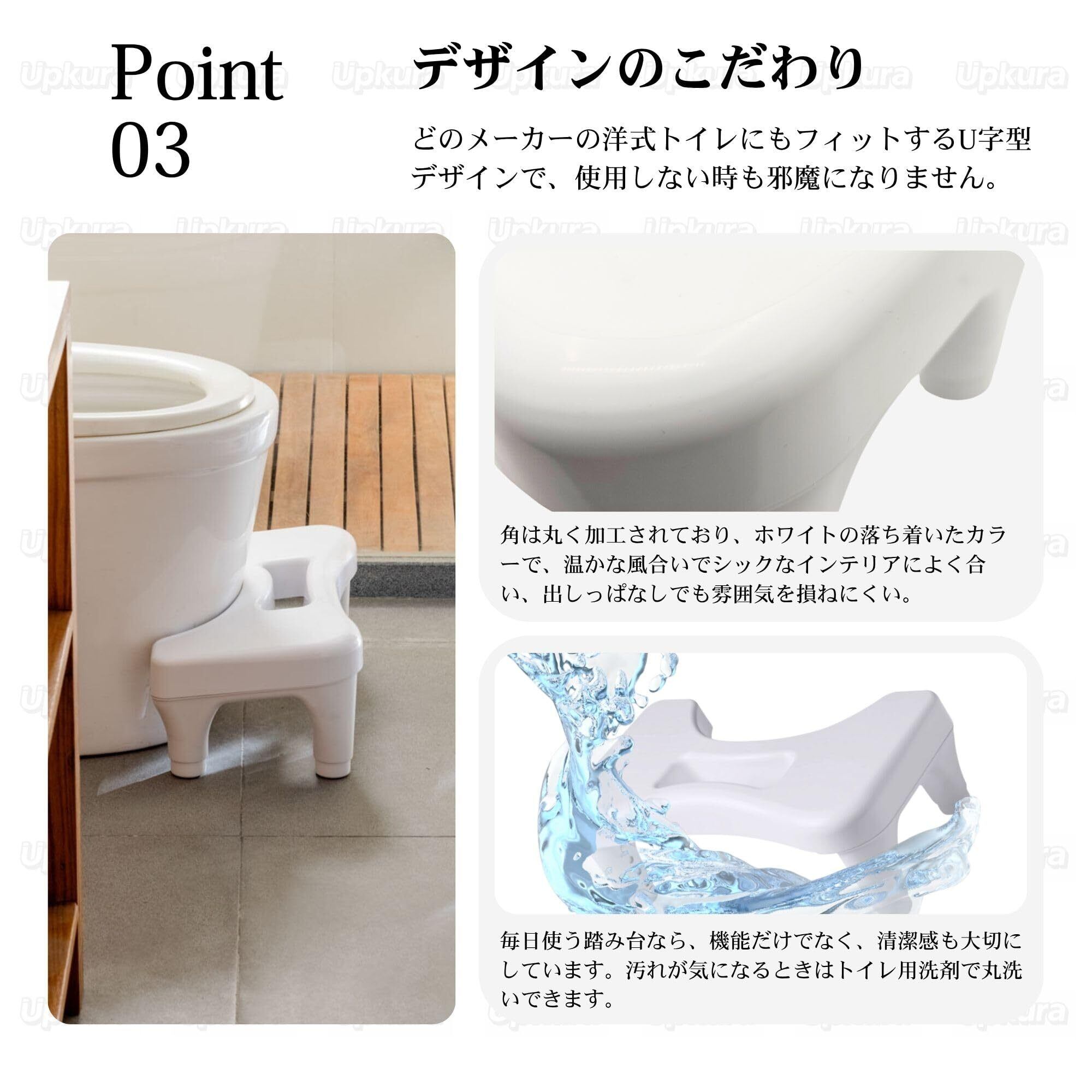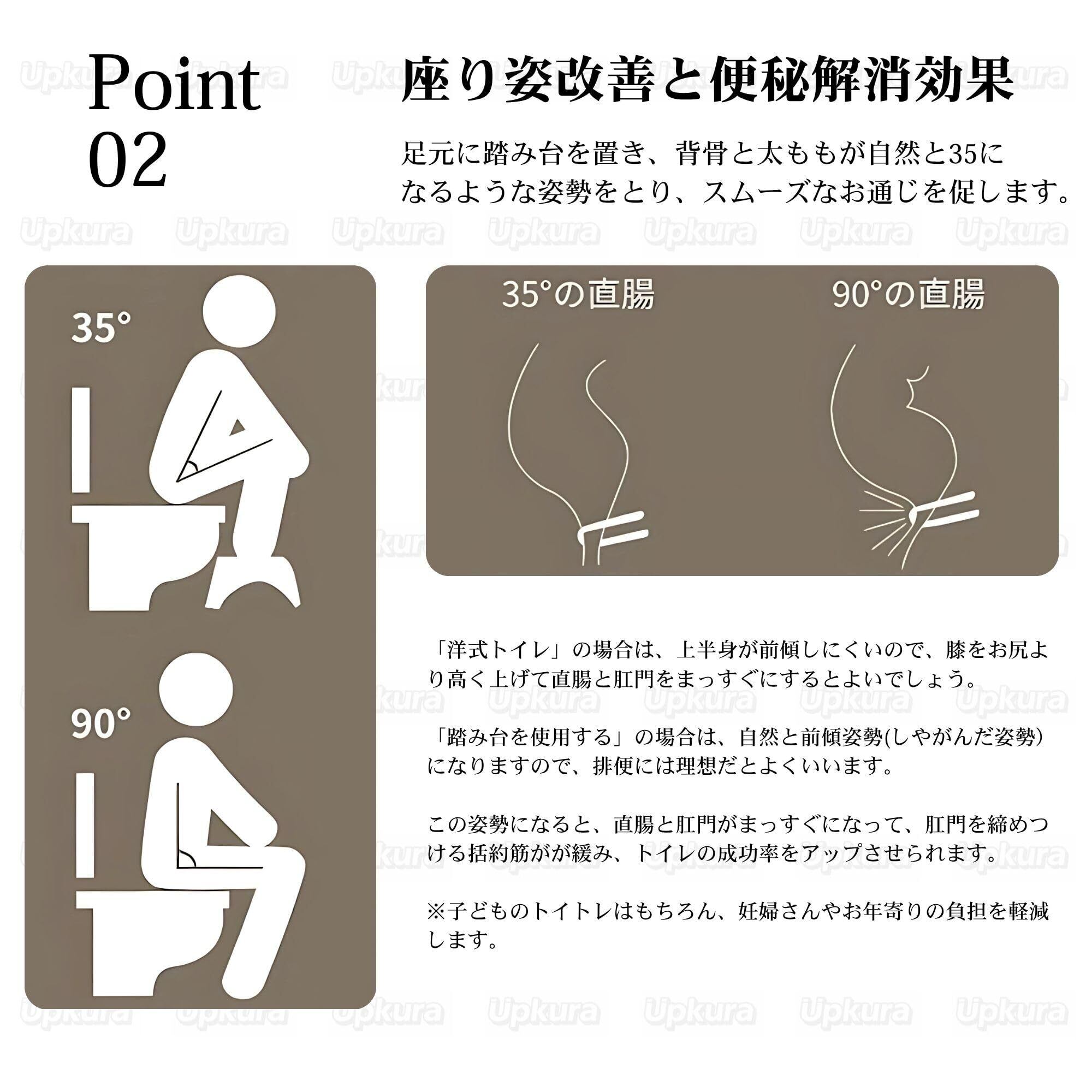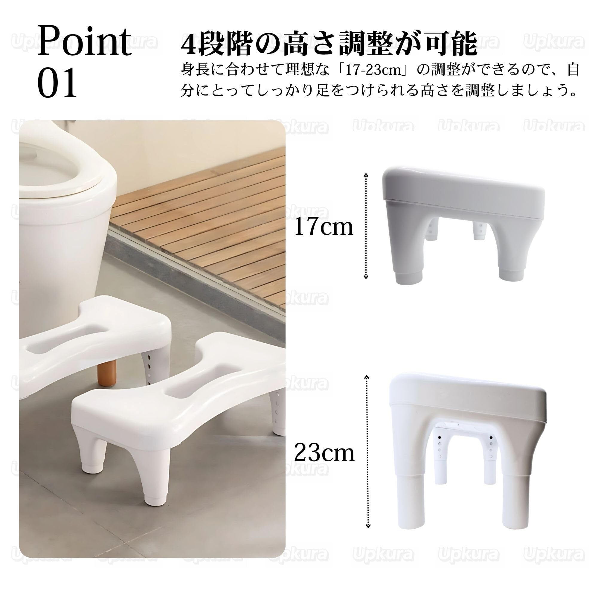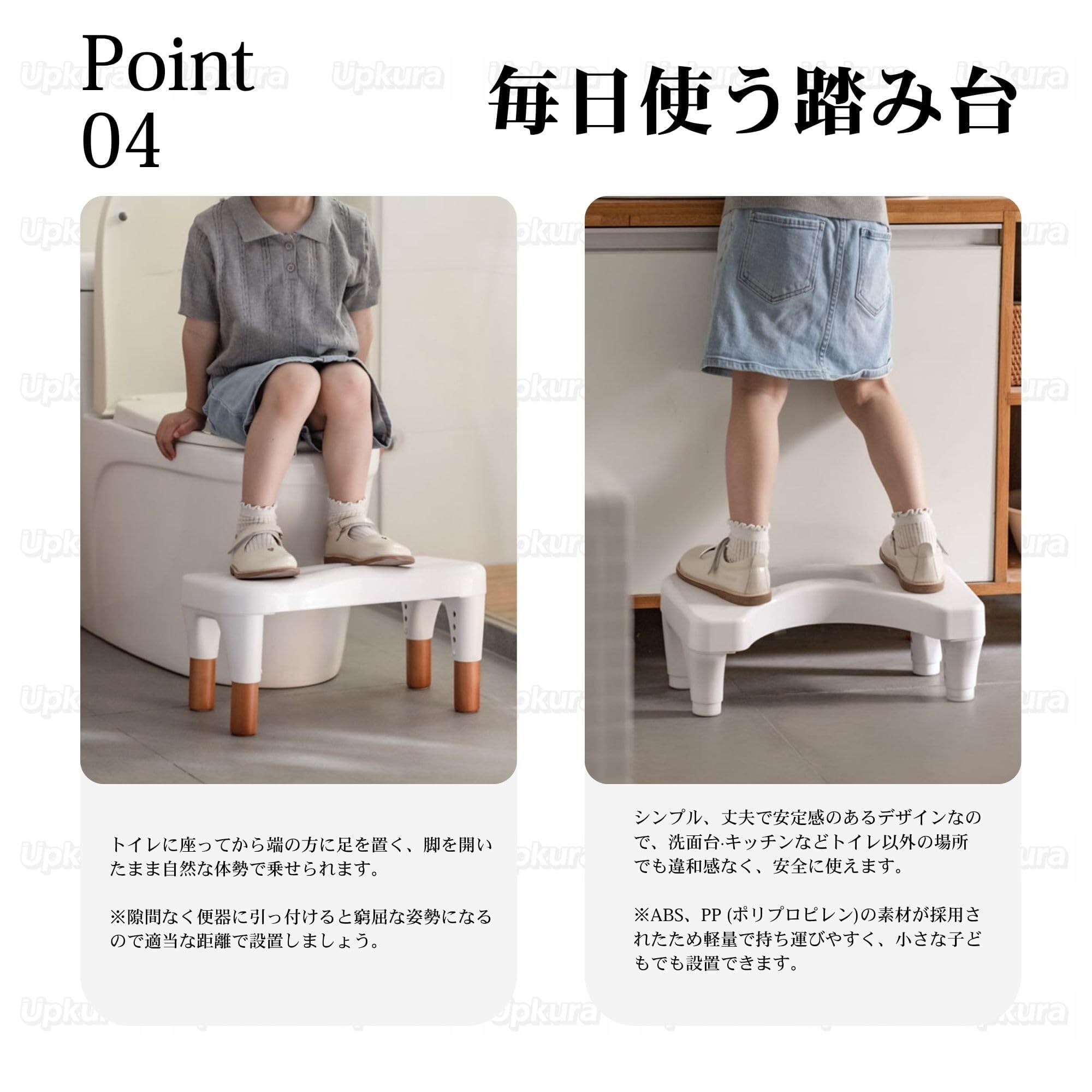 「このUpkuraの踏み台で、家族全員のトイレ利用をより快適にしてみませんか!」/特徴:高さ17〜23cmに調整可能な4段階の設計で、子供から大人まで使いやすい仕様です。耐荷重200kgを達成し、安心して使用できる頑丈な作りが魅力です。